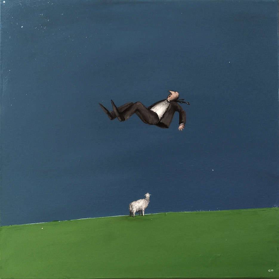 Na obrazie widać mężczyznę w ciemnym garniturze, unoszącego się w powietrzu na tle głębokiego, granatowego nieba. Poniżej, na zielonej łące, stoi owca, patrząc w górę. Kompozycja jest oszczędna, ale przyciąga uwagę swoją oryginalnością. Kolorystyka jest kontrastowa: ciemne niebo, żywa zieleń i biały puch owcy tworzą ciekawą harmonię. Atmosfera obrazu jest surrealistyczna, trochę tajemnicza. Wygląda jak scena z snu, gdzie prawa fizyki nie rządzą. Techniką artysta zdaje się operować prostotą formy, co wzmacnia niecodzienny nastrój. Mężczyzna robi się jakby oderwany od rzeczywistości, co może wywoływać w widzu poczucie... zagubienia? Emocje mogą być różne: od zdumienia po lekki uśmiech. Myśli mogą błądzić w stronę pytań o naturę rzeczy, o to, co jest "real". Dziecko pewnie powie: "Pan lata, jak Superman!" To także prowokuje do zastanowienia, czy nasze codzienne życie czasem nie jest właśnie takim unoszeniem się w nieznane. Prosto napisany obraz, a jednak pełen ukrytych znaczeń.
