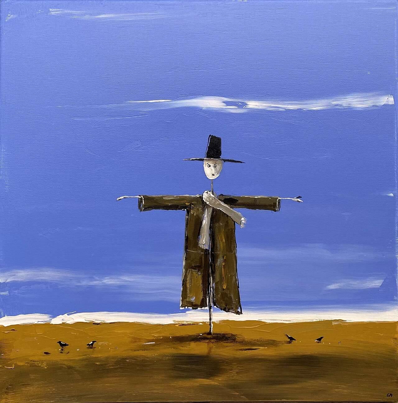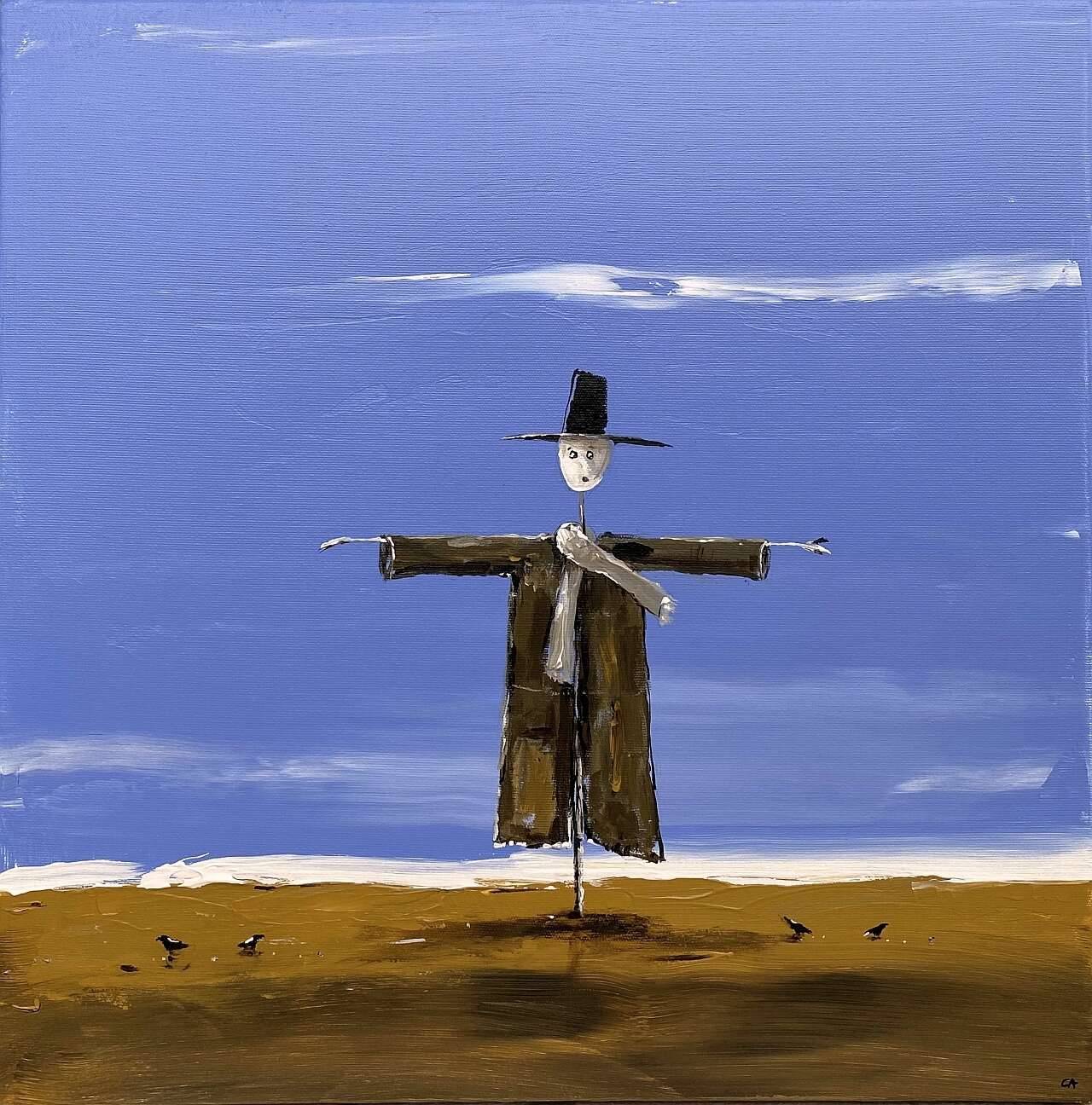 Na obrazie widzimy prostą, lecz niezwykle sugestywną kompozycję. Dominują niebieskości nieba, które nadają całości spokój i pewną melancholię. Na pierwszym planie stoi strach na wróble, rozciągając ręce w gest rozpostarcia, jakby chciał objąć cały krajobraz. Brąz płaszcza i kapelusza kontrastuje z jasnym odcieniem twarzy i dodaje mu charakteru. Tło, spokojne i nienachalne, przełamują delikatne białe smugi - może to chmury? Atmosfera obrazu jest nieco nostalgiczna, a jednocześnie pełna prostoty i ciszy, jakby świat się zatrzymał. Artysta zastosował grubą warstwę farby, co dodaje fakturze głębi i surowości. Styl minimalistyczny, ale intryguje, przyciąga wzrok i prowokuje do zatrzymania. Nakładając szybkie pociągnięcia pędzla, stworzył efekt dynamicznej statyczności - to dość magiczne. W duszy malunku wyczuwalna jest samotność, ale pomimo tego, emanuje z niego pewność i stabilność. Patrzenie na ten obraz przypomina smakowanie wspomnień z dzieciństwa. Czuję, jak wracam myślami do dni spędzonych na wsi. "To wygląda jak mój strach na wróble z bajki!" mogłoby powiedzieć zachwycone dziecko. Ten obraz jest jak echo z przeszłości, delikatne, a jednak wyraźne. W powietrzu unosi się coś magicznego, a to one moment in time zatrzymany na płótnie.