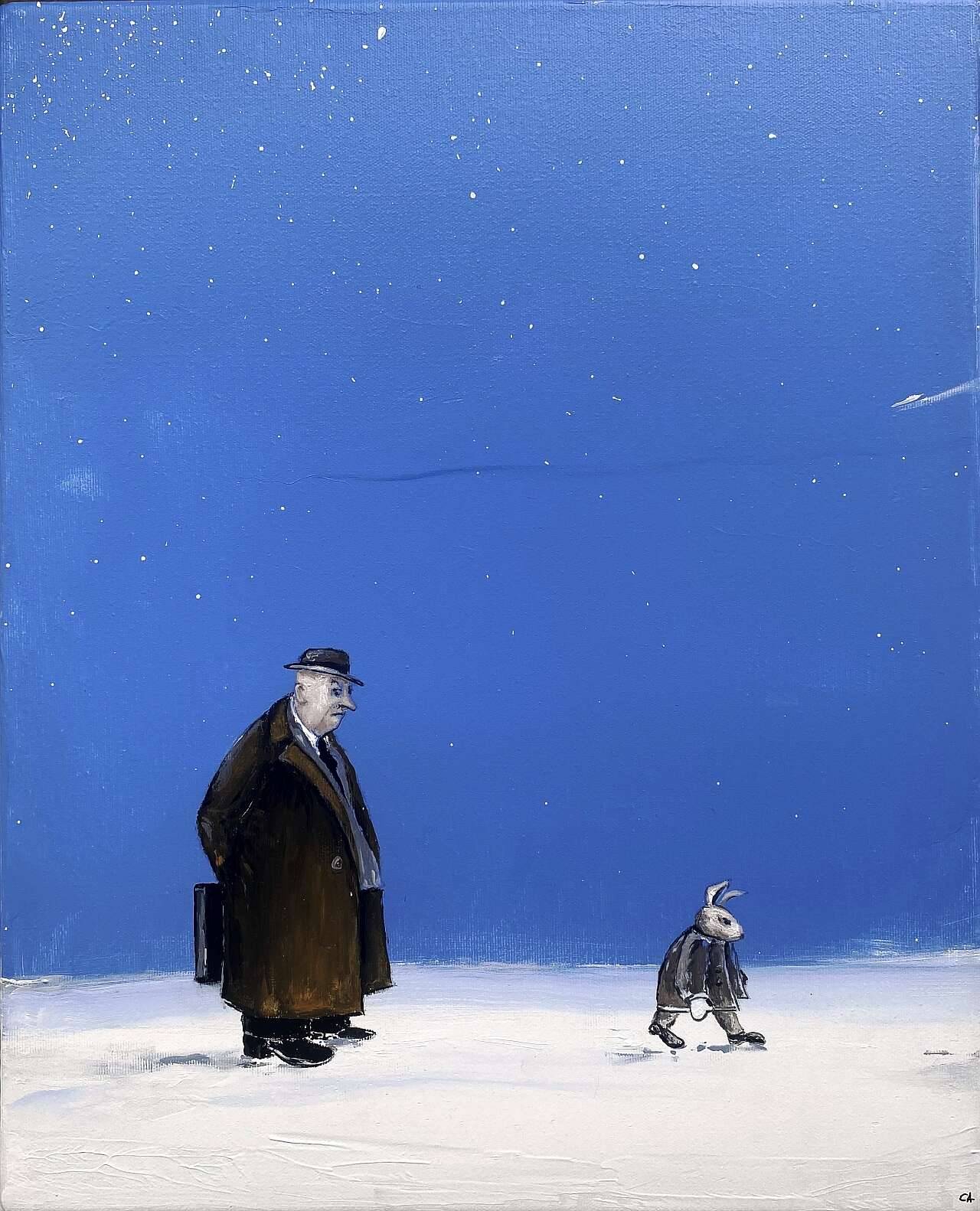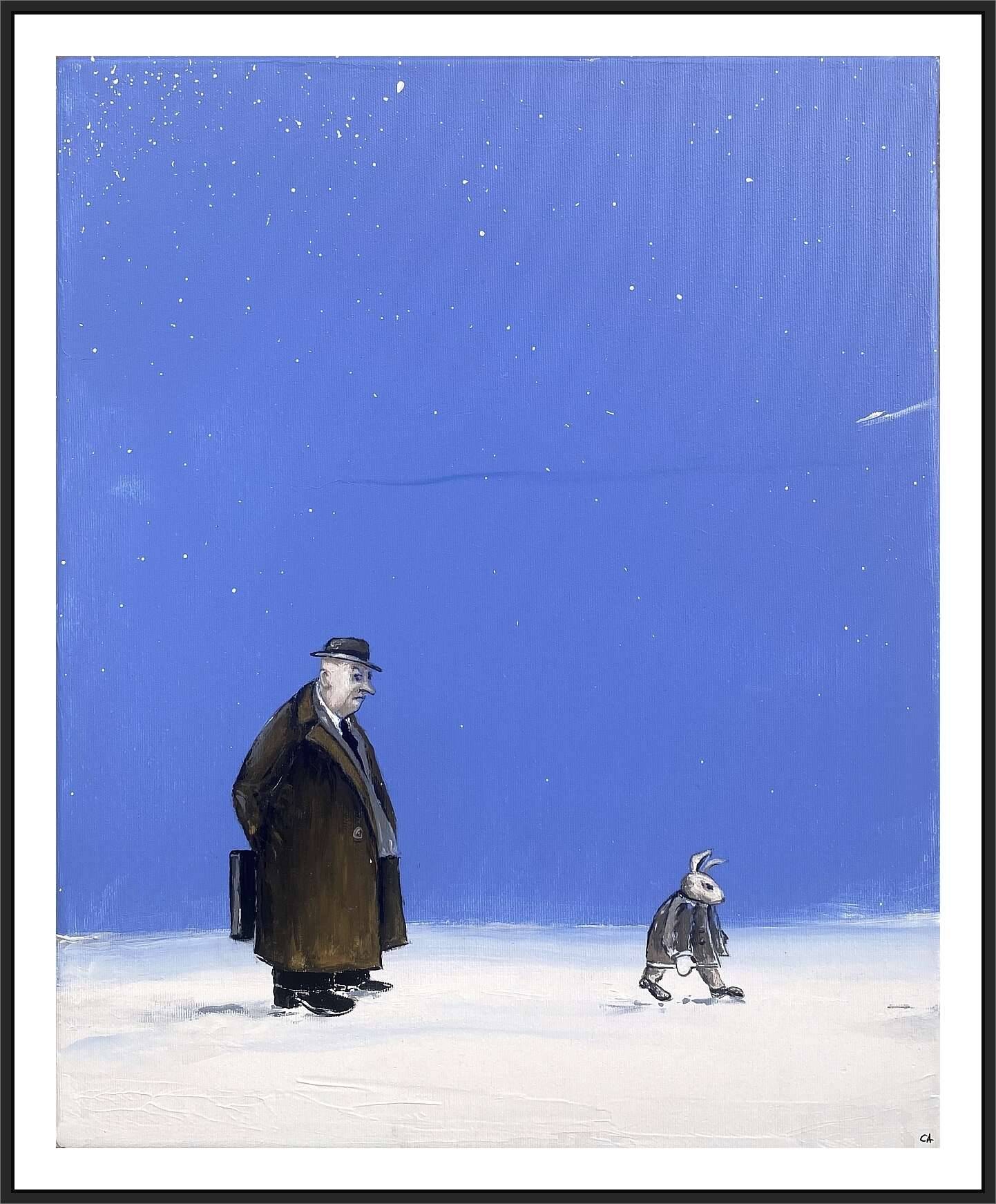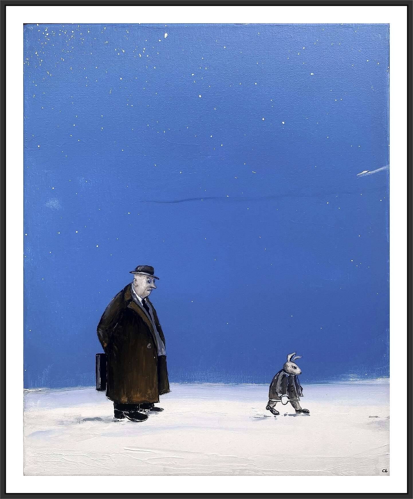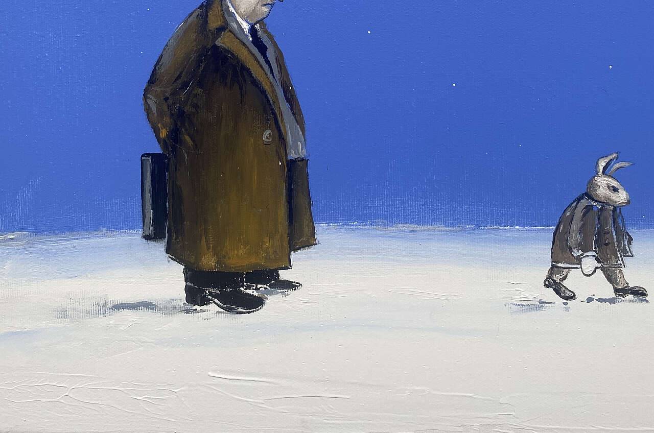 Na obrazie dominuje głęboki błękit nieba i śnieżnobiała powierzchnia ziemi. Uwagę przyciągają dwie postacie: starszy mężczyzna w klasycznym płaszczu i kapeluszu oraz mały królik elegancko odziany w marynarkę. Ich spotkanie na pustkowiu zdaje się być tajemnicze i niecodziennie. Kompozycja obrazu jest oszczędna, z dużą ilością przestrzeni, co wprowadza nastrój kontemplacji i ciszy. Styl artysty jest wyrazisty, z wyraźnymi pociągnięciami pędzla. To tworzy iluzję ruchu i dynamiki, mimo statycznego charakteru sceny. Wrażenie zimna miesza się z ciepłem ludzkiej obecności i może wywoływać uczucie tęsknoty za rozmową. Niebo jest takie blue, aż chce się patrzeć bez końca. Dziadek powiedziałby, że to surrealizm pełną parą. Dla dziecka każda taka scena to bajka samych kochanych przygód. Patrząc na ten obraz, czuję spokój, ale i ciekawość. Kim są te postacie? Może to tylko chwila, a może dłuższa podróż razem.