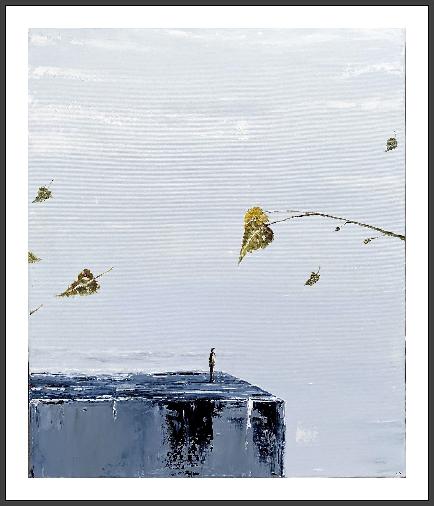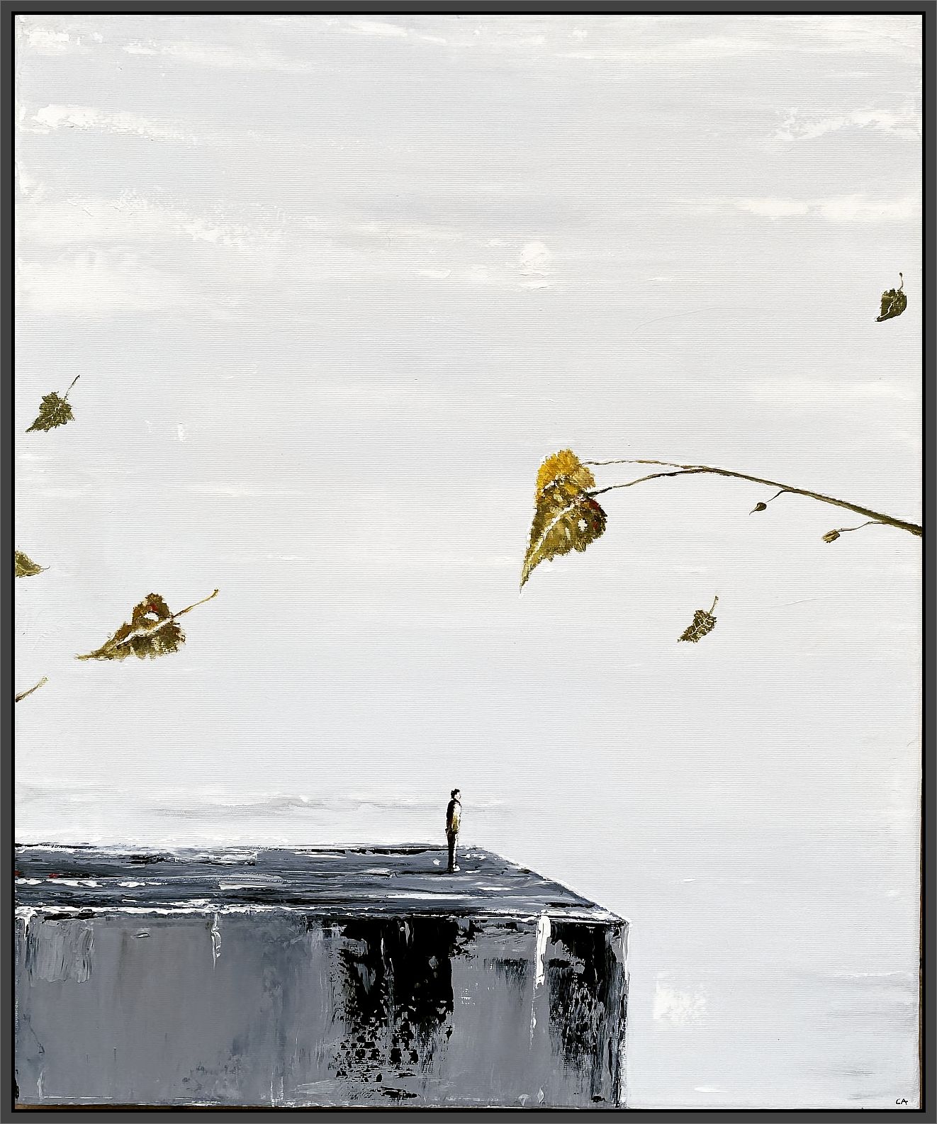 Na obrazie widzimy postać stojącą na krawędzi masywnego bloku, którego chłodny, szary kolor kontrastuje z delikatnością liści unoszonych w powietrzu. Liście wirują wokół, przyciągając wzrok ciepłymi odcieniami złota i brązu. Ta scena jest zanurzona w miękkim, niemalże mglistym tle, które emanuje spokojem i wyciszeniem. Wydaje się, jakby czas stanął w miejscu. Minimalizm kompozycji podkreśla samotność człowieka, pozorną bezbronność wobec ogromu świata. Patrząc na ten obraz, można poczuć melancholię i zamyślenie, ale też odrobinę nadziei. Hey, może ktoś zaraz dołączy do tej postaci? Artysta umiejętnie bawi się przestrzenią, łącząc surowość z subtelnością. Rysunek zdaje się łączyć elementy surrealizmu z nowoczesnym podejściem do formy. Dziecko patrzące na obraz mogłoby powiedzieć: "Liście tańczą wokół pana!". Ta wizualna opowieść sprawia, że czujemy się zawieszeni między snem a rzeczywistością.