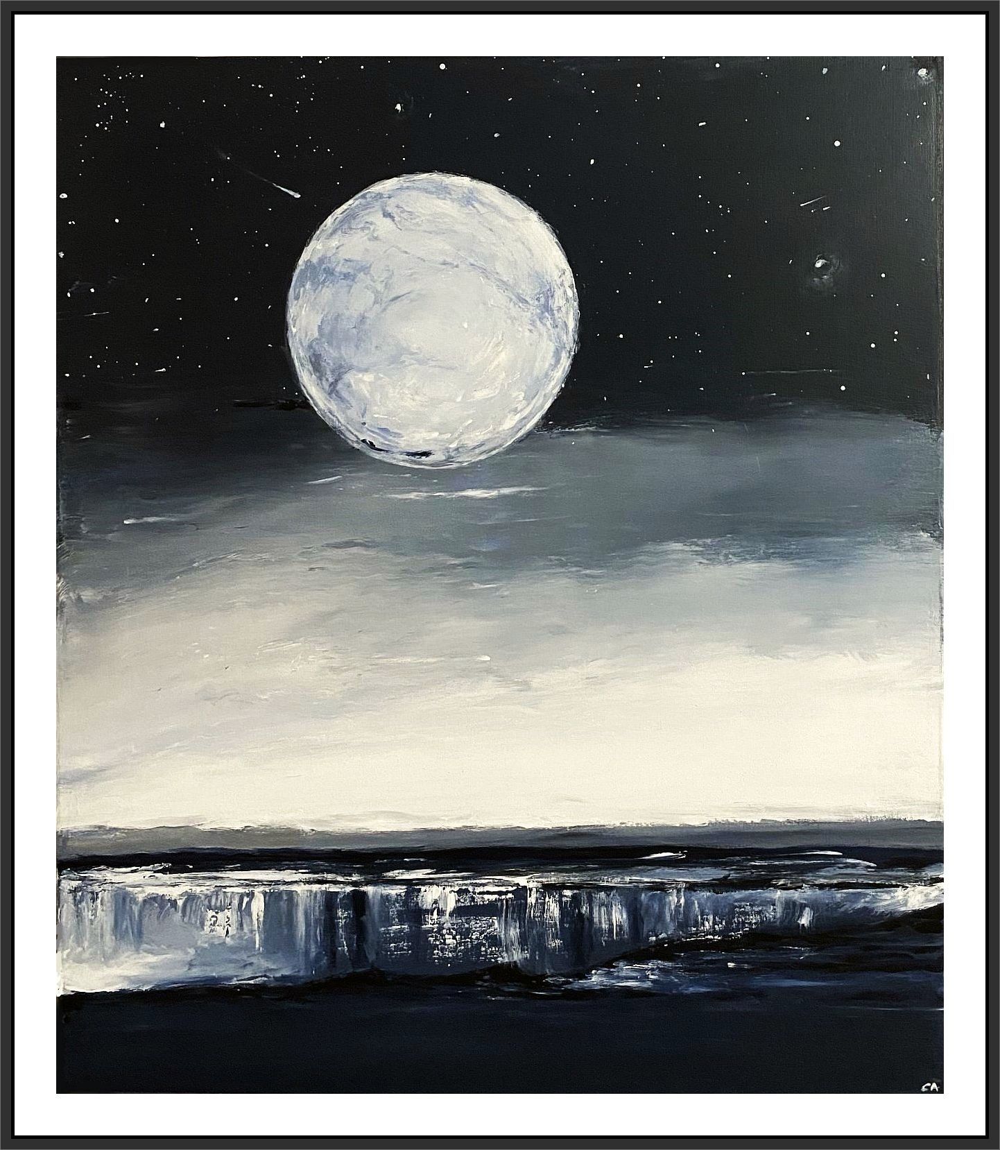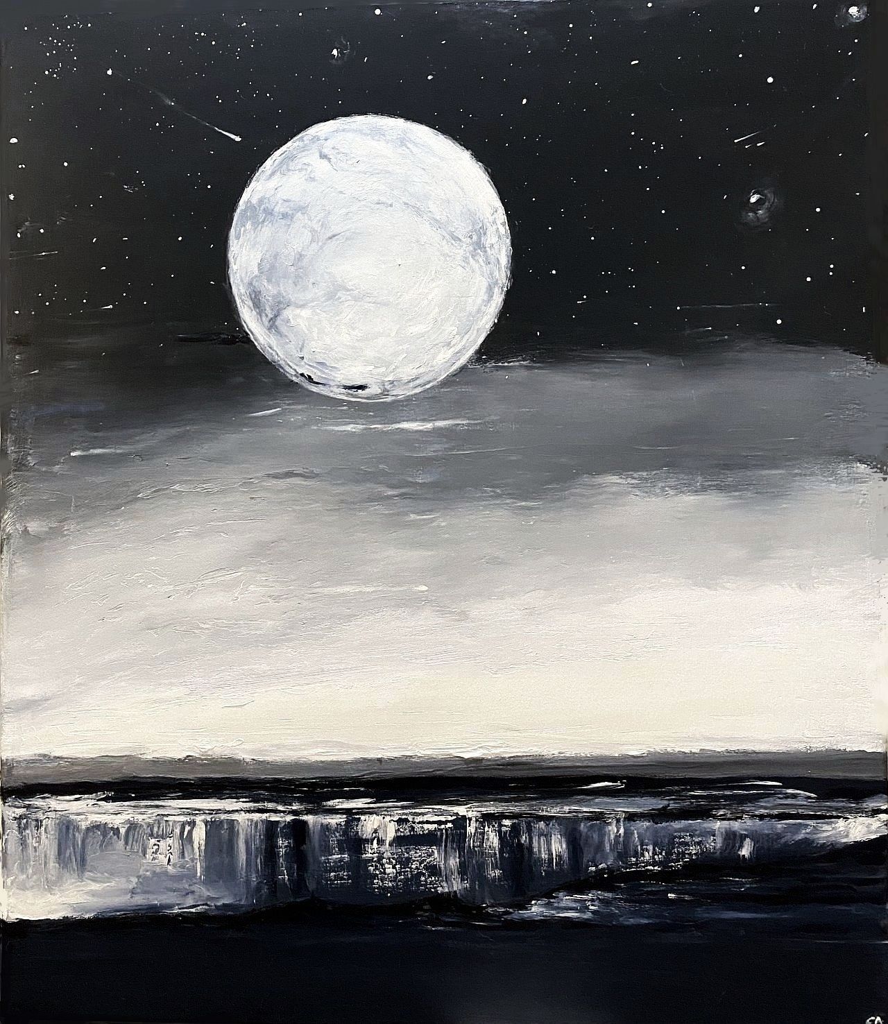 Na tym obrazie dominuje monochromatyczna paleta barw, w której czerń, biel i odcienie szarości łączą się w hipnotyzującą kompozycję. Centralnym punktem jest gigantyczny, biały krąg przypominający księżyc, zawieszony na tle ciemnego, gwiaździstego nieba. Krajobraz poniżej wygląda jak bezkresna, lodowa pułapka, a ciemne pociągnięcia pędzla tworzą złudzenie wodospadu z lodu. Atmosfera jest tajemnicza, niemalże magiczna. Taki trochę moonlit wonderland. Styl obrazu przypomina surrealistyczne pejzaże, które mają w artystyczny sposób uchwycić to, co niewidzialne. Artysta używa dynamicznych pociągnięć pędzla, aby dodać dramatyzmu i głębi. Miałam wrażenie, że to widok z innego świata. Dla siedmioletniego dziecka ten obraz może być jak jakaś bajkowa podróż na Księżyc. Podziwiając dzieło, można odczuć pewną melancholię i zadumę. Jakby przestrzeń i czas na chwilę się zatrzymały. Obraz prowokuje do zadumy nad ogromem wszechświata i naszym miejscem w nim. Gapiłam się na ten obraz i miałam wrażenie, że wystarczy jeden krok, by znaleźć się w tej lodowej krainie. Wow, co za emocje!