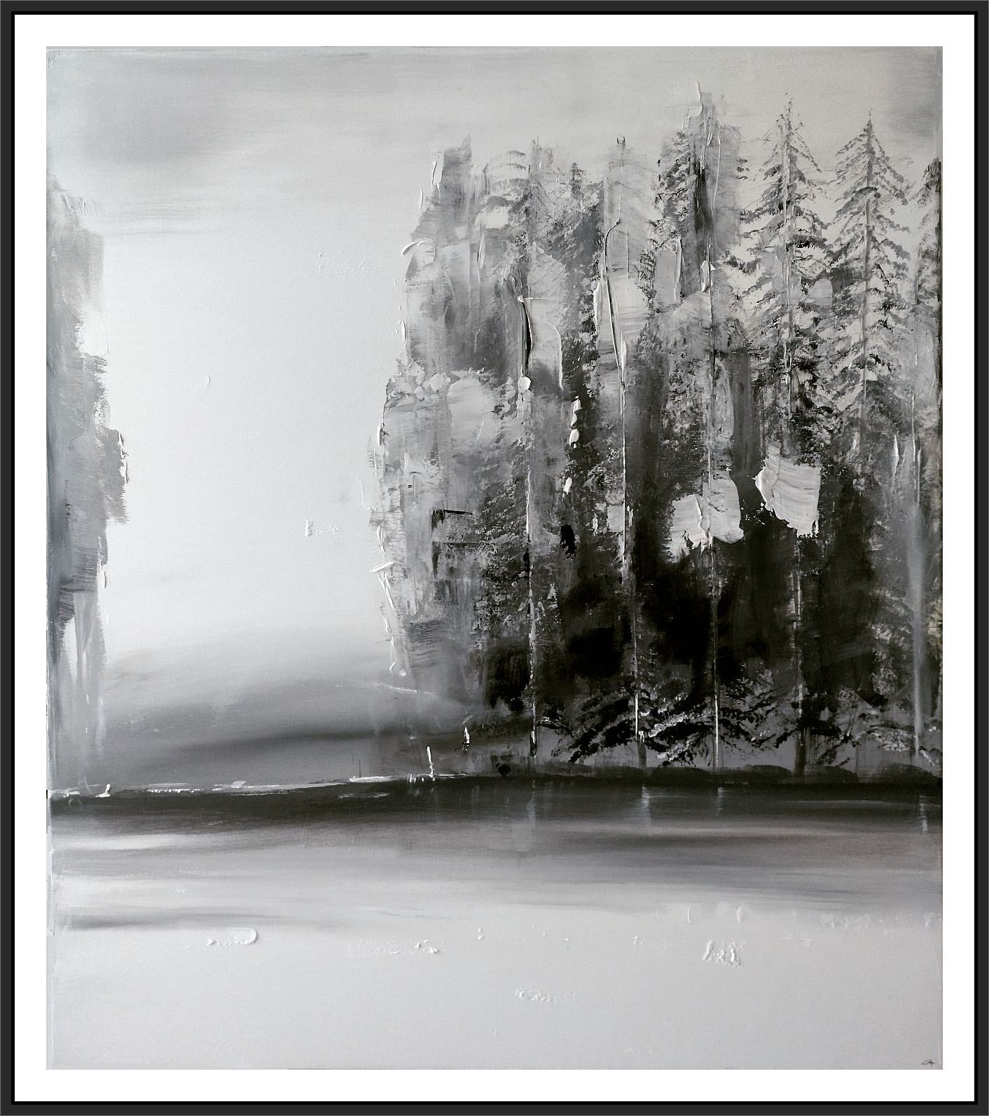 Obraz tonie w skali szarości, od popielu po grafit, z gęstym skupiskiem drzew po prawej i szeroką, mleczną wodą u dołu. Poziome smugi budują horyzont, a pionowe impasty i ślady szpachli rysują korony, z których spływają cieniutkie pnie. Po lewej prawie czyste powietrze, negatyw przestrzeni równoważący ciężar lasu. Panuje poranny chłód, cisza jak po pierwszym śniegu, trochę nostalgii. Ja słyszę wręcz stillness. Styl hybrydowy, między minimalizmem a pejzażową abstrakcją, laserunki mieszają się z grubą fakturą, miekko i troche szorstko. To jest las i jest dużo szarych drzew i woda. Czuję spokój i małe ukłucie samotności, jak przed rozmową, i myślę że właśnie to mnie tutaj trzyma.