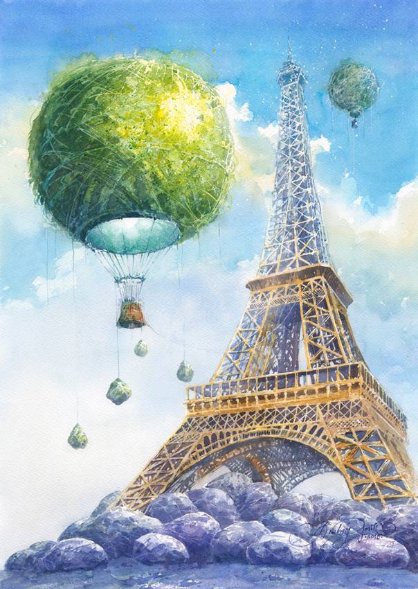 Ten obraz to istny cud, przykuwający wzrok swoją magiczną aurą. Jasnoniebieskie niebo stanowi idealne tło dla majestatycznej Wieży Eiffla, która złociście lśni w promieniach słońca. Wokół niej unoszą się nietypowe balony – niczym olbrzymie kule zieleni, które w pierwszej chwili kojarzą się z gigantycznymi główkami sałaty. To naprawdę wow! Kompozycja jest zrównoważona, lecz jednocześnie zawiera pewien element zaskoczenia. Wieża Eiffla, główny punkt odniesienia, wydaje się być przytulona do ziemi, podczas gdy balony, lekkość sama w sobie, zdają się unosić z niewymuszoną gracją. Kolory, głównie odcienie zieleni, błękitu i złota, tworzą harmonię przyjemną dla oka. Wow, ale to jest super! Artystycznie mamy tu do czynienia z efektem akwareli, która daje obrazowi miękkość i eteryczność. Artysta bawi się światłem i kolorem, tworząc impresję pełną lekkości i fantazji, która potrafią obudzić w widzu nostalgię za miejscami, które być może nigdy nie istniały. To takie dreamy, jakbyście chcieli się przenieść do tego świata. To może być interpretowane jako marzenie o swobodzie, podróży i oderwaniu się od codzienności. Kiedy patrzę na te zielone balony, czuję przypływ spokoju i radości. Obraz jest deklaracją wszystkiego, co może być możliwe, jeżeli tylko pozwolimy sobie na odrobinę wyobraźni. Świat poza krawędzią realności.