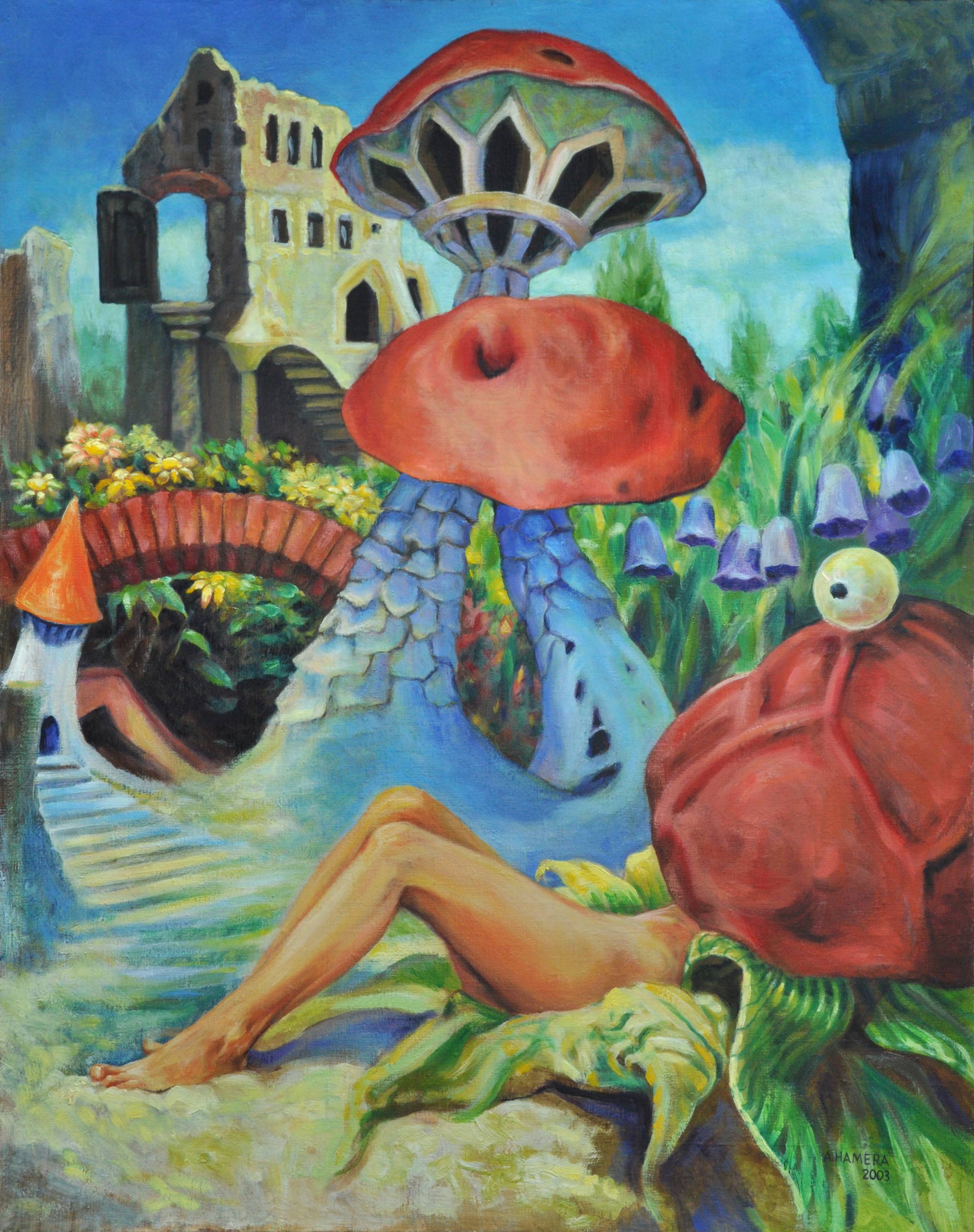 Na obrazie dominują intensywne kolory: głęboki błękit nieba, soczysta zieleń roślinności i czerwone kapelusze grzybów przyciągają wzrok jak magnez. Centralna część płótna zajmują fantazyjne kształty gigantycznych grzybów, przypominających nieco kosmiczne wieże. W tle widnieją tajemnicze ruiny, które dodają kompozycji odrobinę surrealizmu. Obraz emanuje atmosferą baśniowej krainy, gdzie każda ścieżka prowadzi do odkryć. Styl artysty jest jakby mieszanką impresjonizmu z nutką magii, co sprawia, że wszystko wydaje się jak dream z innego świata. Ten świat jest taki dziwny i piękny, że aż chciałoby się znaleźć tam osobiście. Artysta posługuje się odważnymi pociągnięciami pędzla, które tworzą dynamiczną grę kolorów. To jakby dziecięcy sen przeplatał się z rzeczywistością. Praca wywołuje mieszankę zadziwienia i nostalgii, przypominając wspomnienia z dzieciństwa, pełne cudownych i niewiarygodnych przygód. Odbiorca może poczuć się zarówno zaciekawiony, jak i nieco zagubiony w tej fantastycznej krainie. Wszystko to sprawia, że obraz staje się miejscem do ucieczki, gdzie zwykłe zasady nie mają znaczenia i można dać się ponieść wyobraźni.