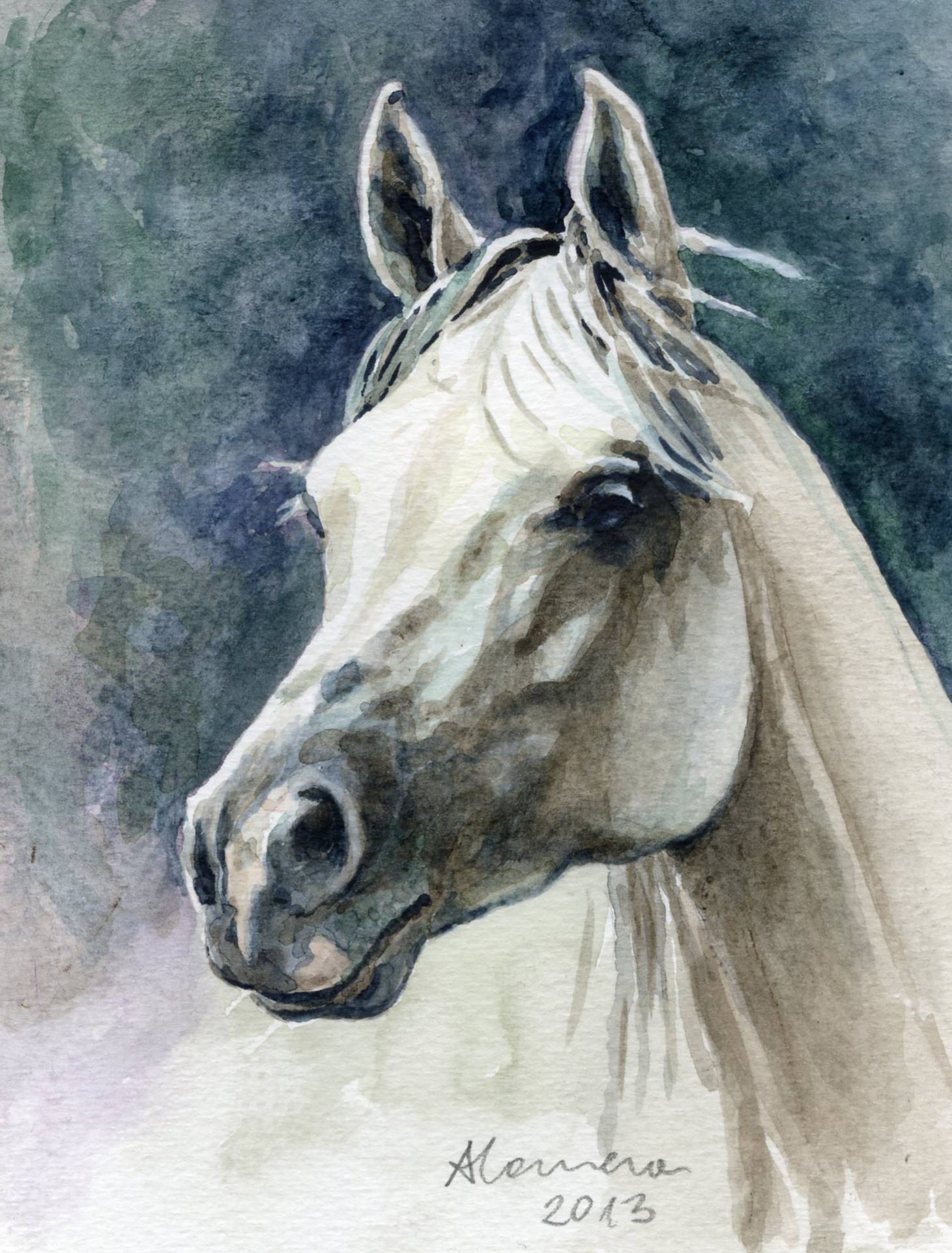 Na tym fascynującym obrazie widać końską głowę uchwyconą w technice akwareli. Dominuje tutaj paleta stonowanych, pastelowych kolorów, szczególnie odcienie szarości i beżu, które płynnie przechodzą w ciemniejsze tło. Kształty końskiej głowy są miękkie i subtelnie zarysowane, co nadaje pracy lekkości i delikatności. Szczególnie imponuje sposób, w jaki artysta uchwycił teksturę sierści – widać tu delikatne pociągnięcia pędzla, które sprawiają, że obraz zdaje się niemal ożywać pod okiem widza. Patrząc na ten obraz, można poczuć spokój i harmonię, jakby koń zaraz miał przemówić słowami. A może i nie? Styl artysty jest wyjątkowo realistyczny, ale z nutą impresjonizmu, co podkreślają lekko rozmyte kontury. To właśnie dzięki temu obraz emanuje subtelną i nostalgiczną atmosferą. Można poczuć swoiste „connection” z tym pięknym stworzeniem, a jego spojrzenie zdaje się zaglądać w głąb duszy. Moje dziecko powiedziałoby, że to koń, który pilnuje marzeń. Trochę w tym prawdy. Wpatrując się w ten obraz, czuję się zanurzony w przyrodzie, odcinając się od zgiełku codzienności. Daje to chwile wytchnienia, kiedy otacza nas ciepło i spokój. Akwarele, które artysta zastosował, dodają mu eteryczności, podkreślając ulotność chwili. Obraz potrafi wzruszyć i zainspirować. Czyż nie jest to magiczne?