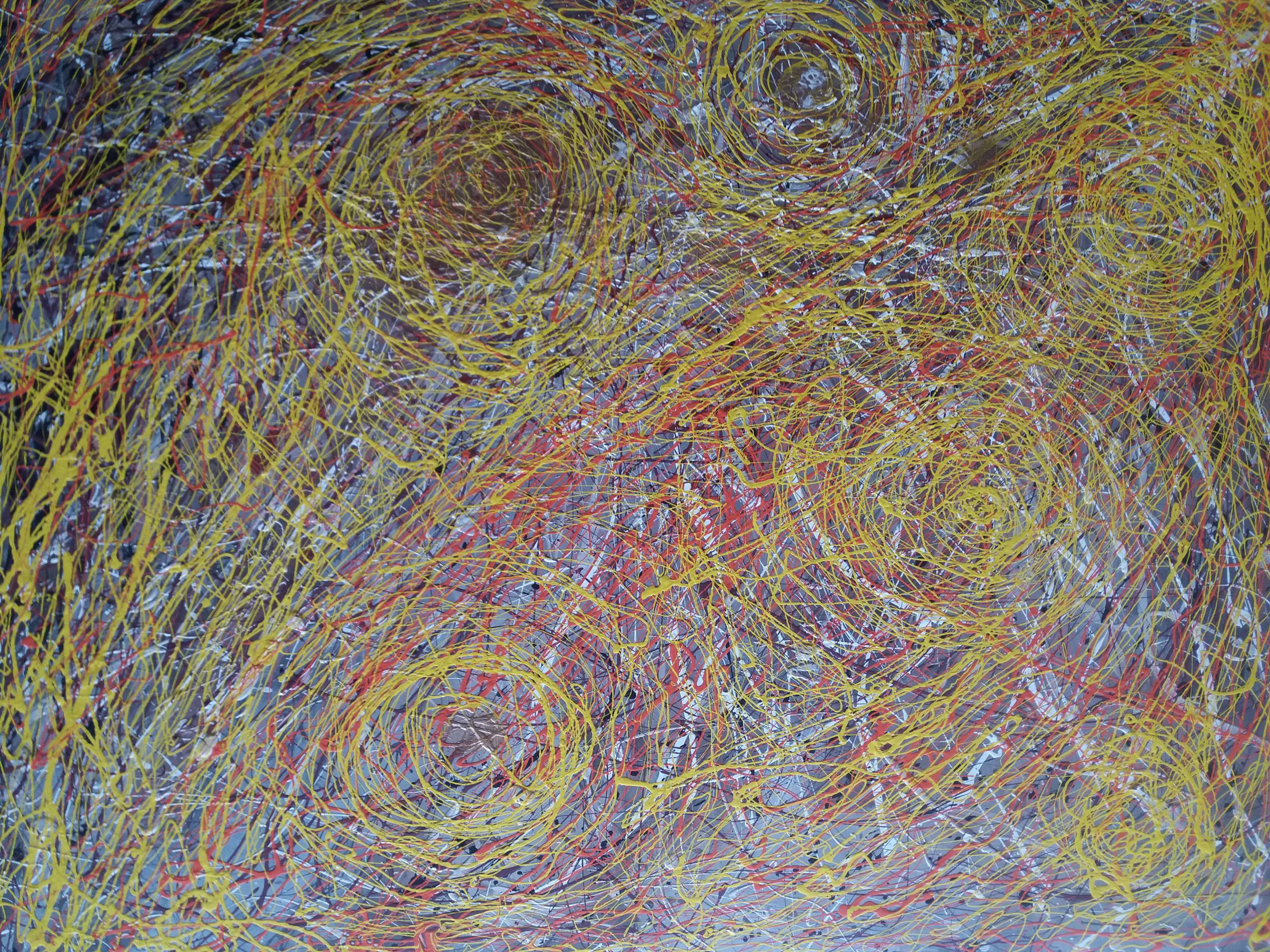 Obraz jest pełen energii i ruchu, jakby ktoś wziął szczotkę i rozkręcił wiry na płótnie. Dominują na nim żółte i czerwone linie, które plączą się w chaotycznym tańcu na tle stonowanych niebiesko-szarych odcieni. To jakby niebo tuż przed burzą, pełne napięcia i oczekiwania na to, co nadchodzi. Technika używana przez artystę przypomina action painting, pełna spontaniczności i intuicji. Każda linia wydaje się krzyczeć "Alive!", jakby obraz żył własnym życiem. Atmosfera dzieła jest intensywna, może nawet trochę dzika i nieokiełznana. Kiedy patrzę na to, czuję, jak serce bije mi szybciej. Czy to nie jest zabawne? Moje dziecko powiedziałoby pewnie: "Wygląda jak kolorowe spaghetti!" I coś w tym jest. Ta eksplozja barw i form wywołuje mieszane uczucia radości i niepokoju. Może to odzwierciedlenie naszych wewnętrznych zmagań, burzy myśli, które czasem próbujemy ujarzmić. Każdy znajdzie tu coś dla siebie, a im dłużej patrzysz, tym więcej dostrzegasz. Czy ten chaos nie jest przypadkiem piękny?