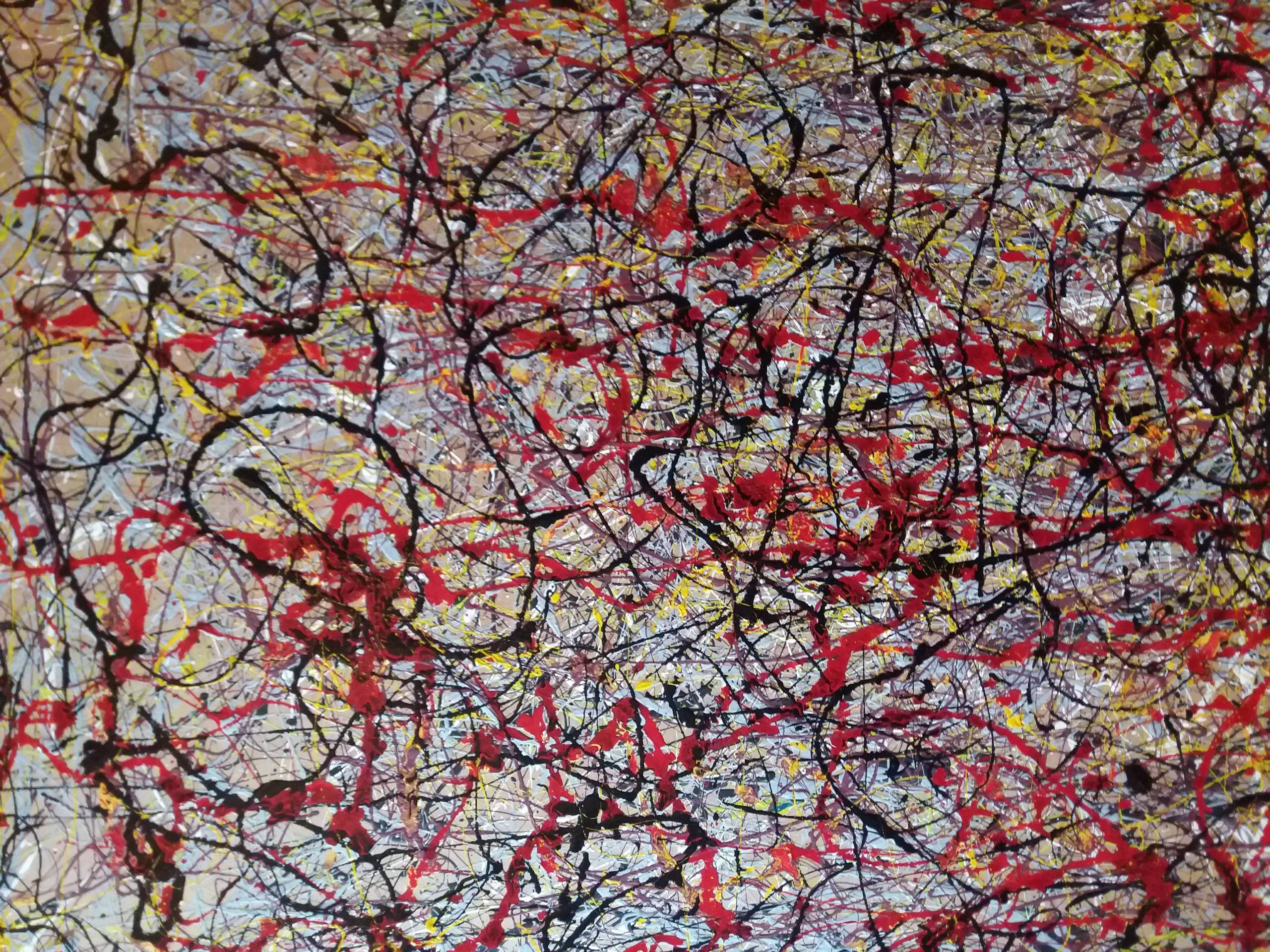 Obraz przedstawia zawiły labirynt kolorów. Dominują pociągłe, chaotyczne linie w odcieniach czerwieni, czerni i żółci, które zdają się tańczyć na neutralnym tle. Artysta użył techniki drippingu, co nadaje dziełu dynamiczny i spontaniczny charakter. W każdym zakamarku płótna życie aż kipi. Atmosfera obrazu jest jednocześnie burzliwa i fascynująca. Chaos ten przyciąga wzrok, zmuszając do zastanowienia się nad sensem ujrzanego bałaganu. Czuje się tu odrobinę zagubienia, ale i nieodpartej ciekawości. Ciekawskim okiem da się dostrzec, że obraz kryje w sobie coś więcej niż tylko kolorowe plamy. To, co widzisz, zależy od tego, jak się czujesz i co ci w duszy gra. Jeden spojrzy i zobaczy rzekę myśli, a inny powie: “to wygląda jak makaron na talerzu!”. Dla mnie to jak labirynt emocji, które każdy z nas przeżywa w środku. Ten obraz jest jak jazz, pełen improwizacji i nieprzewidywalnych zwrotów. Cool, prawda? Może trochę zbyt intensywny dla niektórych, ale z pewnością niezapomniany.