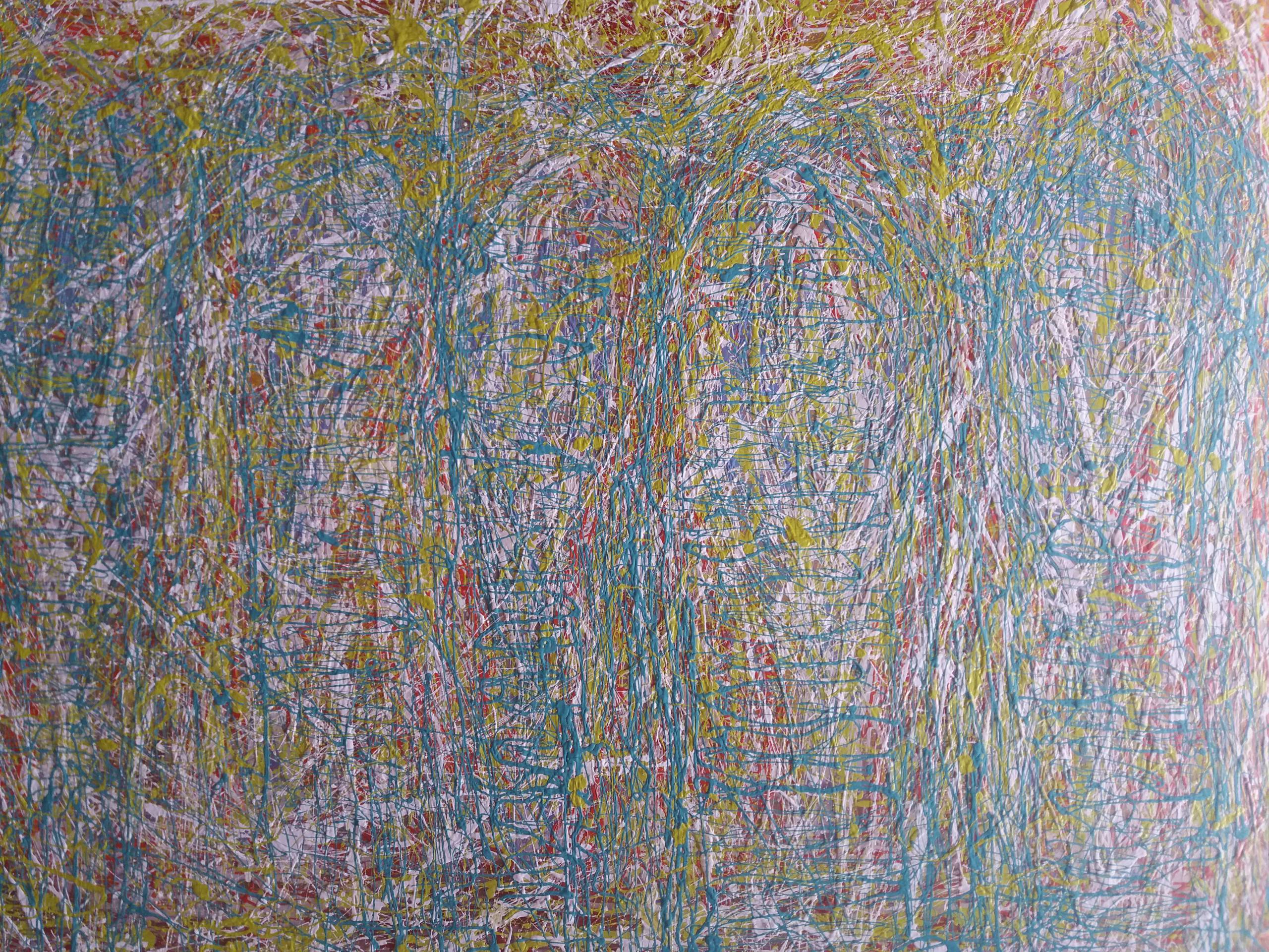 Obraz, na który patrzymy, to prawdziwa uczta dla oczu. Chaos w barwach – dominują tu błękity, żółcie i subtelne biele, które splecione razem tworzą skomplikowaną mozaikę. Wygląda trochę jak mapa miast w chmurach. Te zakrętasy i linie, które biegną we wszystkie strony, sprawiają, że kompozycja wydaje się żywa, jakby miała zaraz ruszyć. Atmosfera to czysty dynamizm, mocna energia. Artysta zastosował technikę, która przypomina chaotyczne zacięcia pędzlem, a może nawet pour painting. To tak, jakby oddał ducha momentu, emocji w czystej postaci. Patrząc na to, można poczuć lekki niepokój, ale i fascynację. Dla mnie to jak wybuch kreatywności, który nie da się zatrzymać. Hey, to jest coś niesamowitego! Widzę w tym obrazku radosne lato, gdzie wszystko kwitnie. Na myśl przychodzą emocje związane z nieprzewidywalnością życia. Obraz jest taki zaskakujący i nieprzewidzialny, a to właśnie sprawia, że można z nim spędzać godziny, odkrywając nowe szczegóły. Czysta abstrakcja, ale tak wow!
