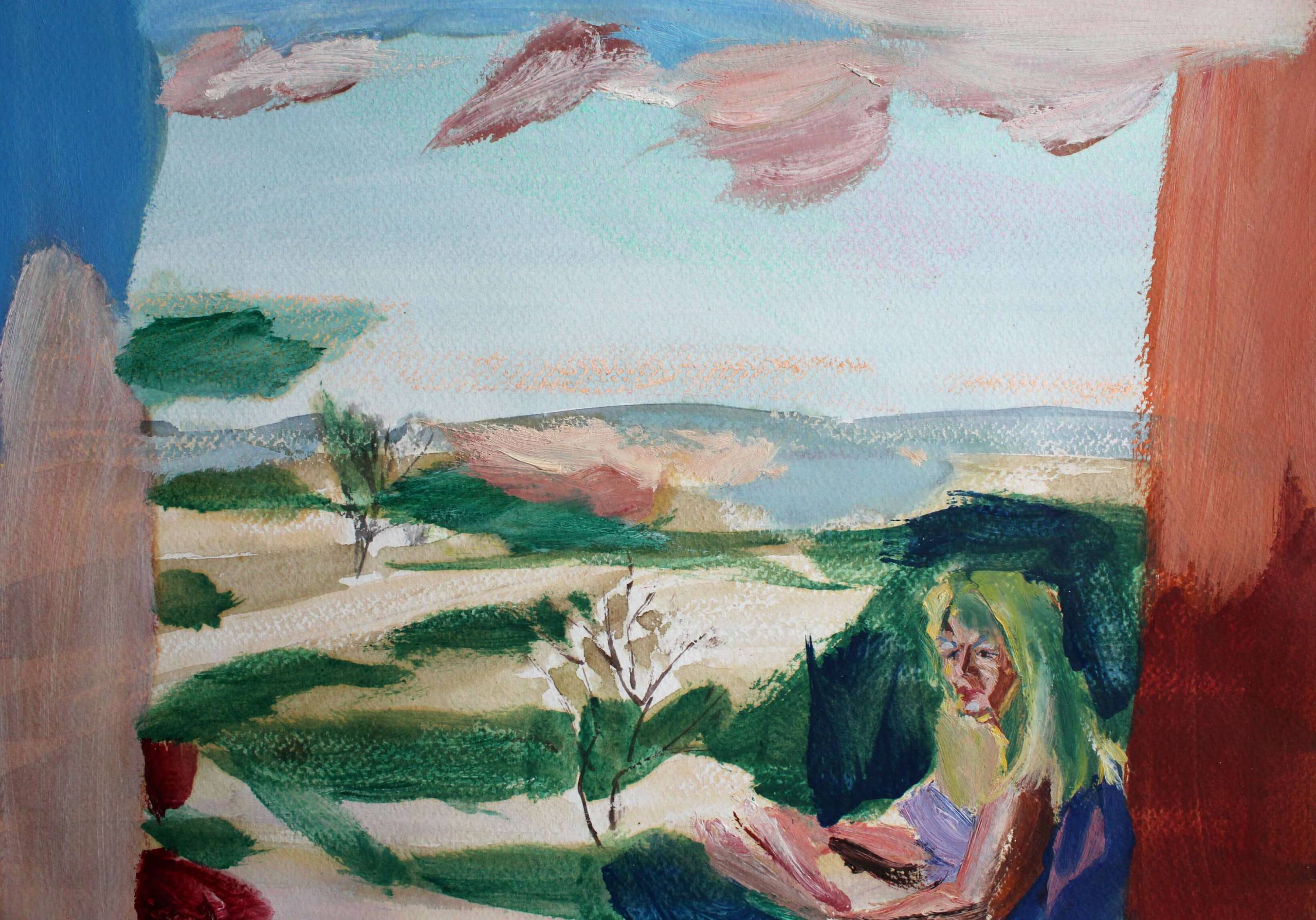 Na obrazie dominują żywe barwy i swobodne pociągnięcia pędzla. Jasnoniebieskie niebo z różowymi chmurami stworza delikatny kontrast z zielenią i ciepłymi odcieniami ziemi. Widać postać kobiety, której zielone włosy przyciągają wzrok, a jej obecność wprowadza subtelną dynamikę do obrazu. Kompozycja przypomina pejzaż z łagodnymi, płynącymi liniami, które prowadzą wzrok po przestrzeni. Obraz ma w sobie taką lekkość i świeżość, jakby ktoś właśnie odkrywał nowy świat. Atmosfera jest spokojna, niemal senny – jak popołudniowa drzemka w słońcu. Artystyczna technika jest dość impresjonistyczna z naciskiem na emocje, nie detale. To sprawia, że całość jest bardziej o uczuciu chwili niż o jej realistycznym odwzorowaniu. Dziecko mogłoby powiedzieć, że pani na obrazie wygląda, jakby czekała na księżniczkę. Wyobrażam sobie, jak stoję tam, czując delikatny wiatr i zapach kwiatów. Jest w tym "touch" spokoju, który łatwo udziela się widzowi.
