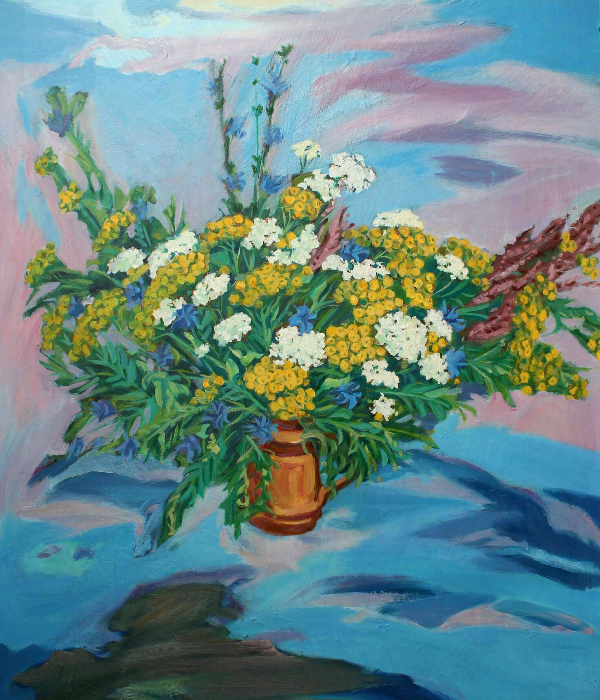 Na płótnie widzimy energetyczny bukiet kwiatów, eksplodujący żywymi kolorami. Dominują tu intensywne żółcie i biele kwiatów, które kontrastują z głębokimi zieleniami liści. Tło jest pełne pastelowych odcieni różu i błękitu, przypominających niebo o zachodzie słońca. Kompozycja sprawia wrażenie dynamicznego ruchu, jakby kwiaty rozkwitały na oczach widza. Artysta używa szerokich pociągnięć pędzla, co nadaje obrazowi impersjonistycznego charakteru. Technika ta, zwana finger-painting, dodaje odrobinę surowej energii. Atmosfera dzieła wydaje się radosna i pełna optymizmu. Kwiaty wyglądają jakby tańczyły, co nadaje obrazowi wrażenie lekkości. Patrząc na ten obraz, czuć delikatny powiew wiosennego powietrza. Dla mnie to jak podróż do tajemniczego ogrodu. Myślę, że każdy może poczuć, że jego serce śpiewa z radości, gdy patrzy na ten kolorowy chaos. A teraz trochę osobistych refleksji. Po prostu uwielbiam, jak te kolory bawią się na płótnie! To jak eksplozja "happiness" zamknięta w malowidle. Chciałbym, żeby taki bukiet stał na moim stole. Wiesz, takie obrazy sprawiają, że czuję się częścią czegoś większego, piękniejszego. Prawda, że to niezwykłe?