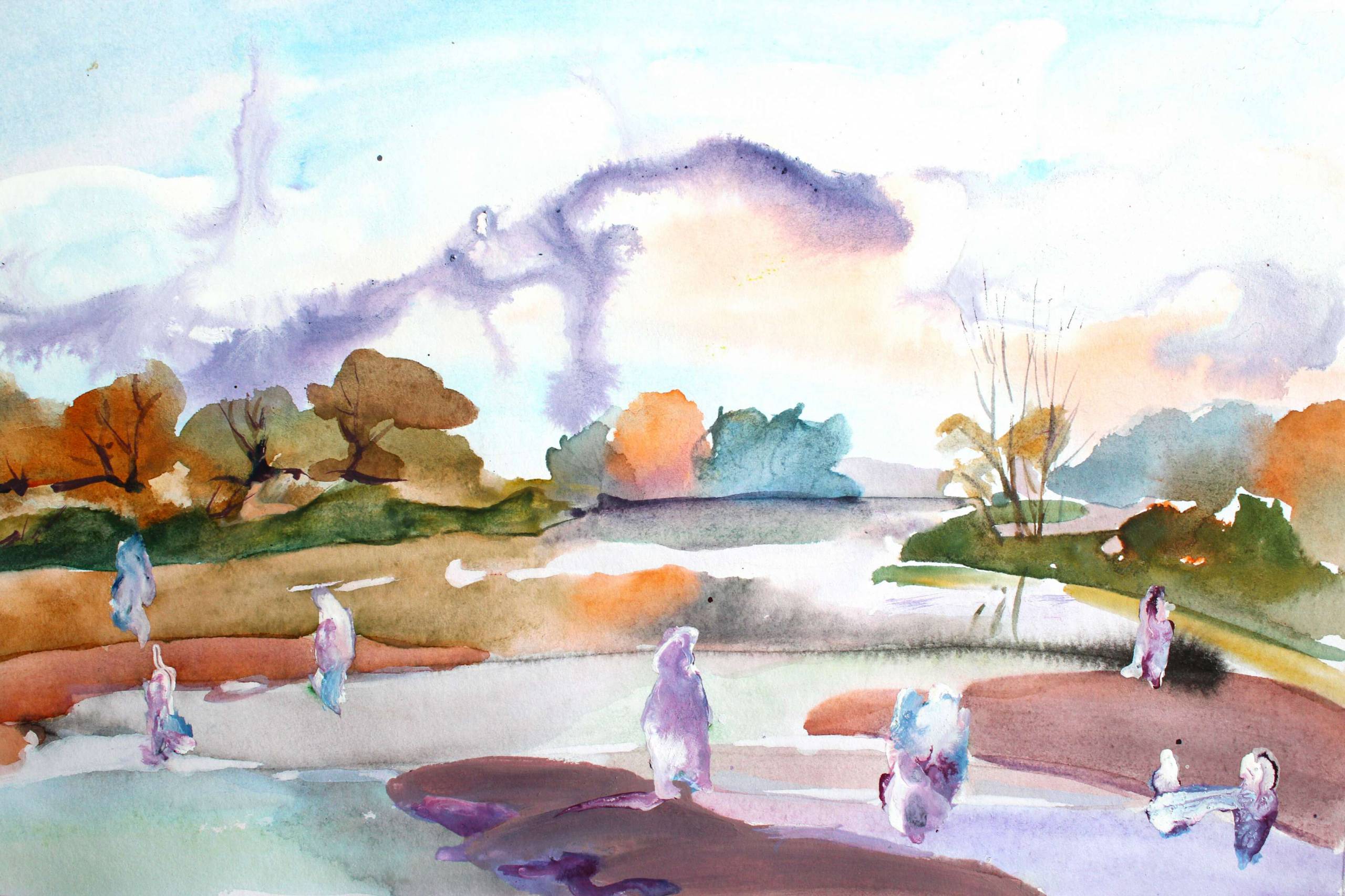 akwarela, pejzaż, woda, ludzie, przestrzeń