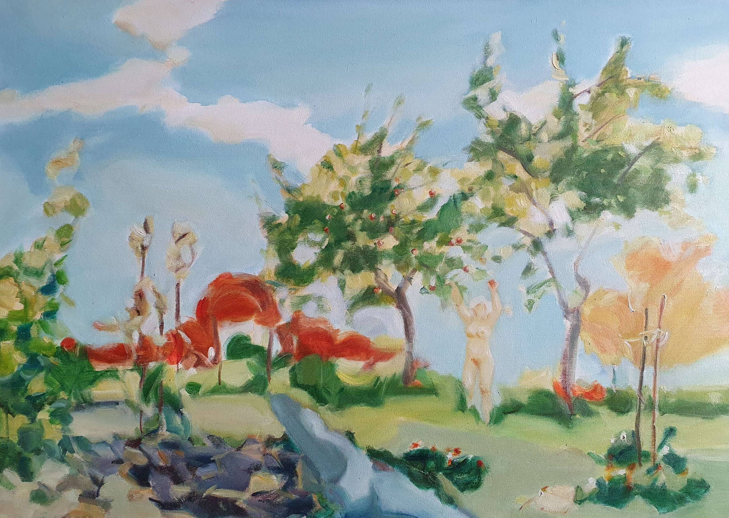 Na obrazie dominują ciepłe kolory, z przewagą zieleni i błękitów, które tworzą wrażenie spokojnego letniego dnia. Kompozycja jest nieco rozmyta, co dodaje jej eterycznego uroku, jakbyśmy spoglądali na wspomnienie lub sen. Drzewa z zielonymi liśćmi są rozłożone po całej płaszczyźnie, a ich nieregularne kształty nadają obrazowi dynamiki. Atmosfera emanuje spokojem, ale i pewną nieuchwytną radością. Technika malowania wydaje się być impresjonistyczna, z małymi plamami kolorów, które harmonijnie się przenikają. Obraz może wywoływać w odbiorcy uczucie nostalgii lub tęsknoty za beztroskimi chwilami na łonie natury. Patrząc na niego, czuję przypływ spokoju i chęć zatrzymania się w biegu życia. Ta jedna postać, jakby tanecznym ruchem unosząca ręce, dodaje scenie elementu playfulness. Obraz to istna sielanka, a ja bym chciał tam być, bawić się pod takim błękitnym niebem. Kolory, jak widać, mogą zmieniać nastrój i to jest amazing.