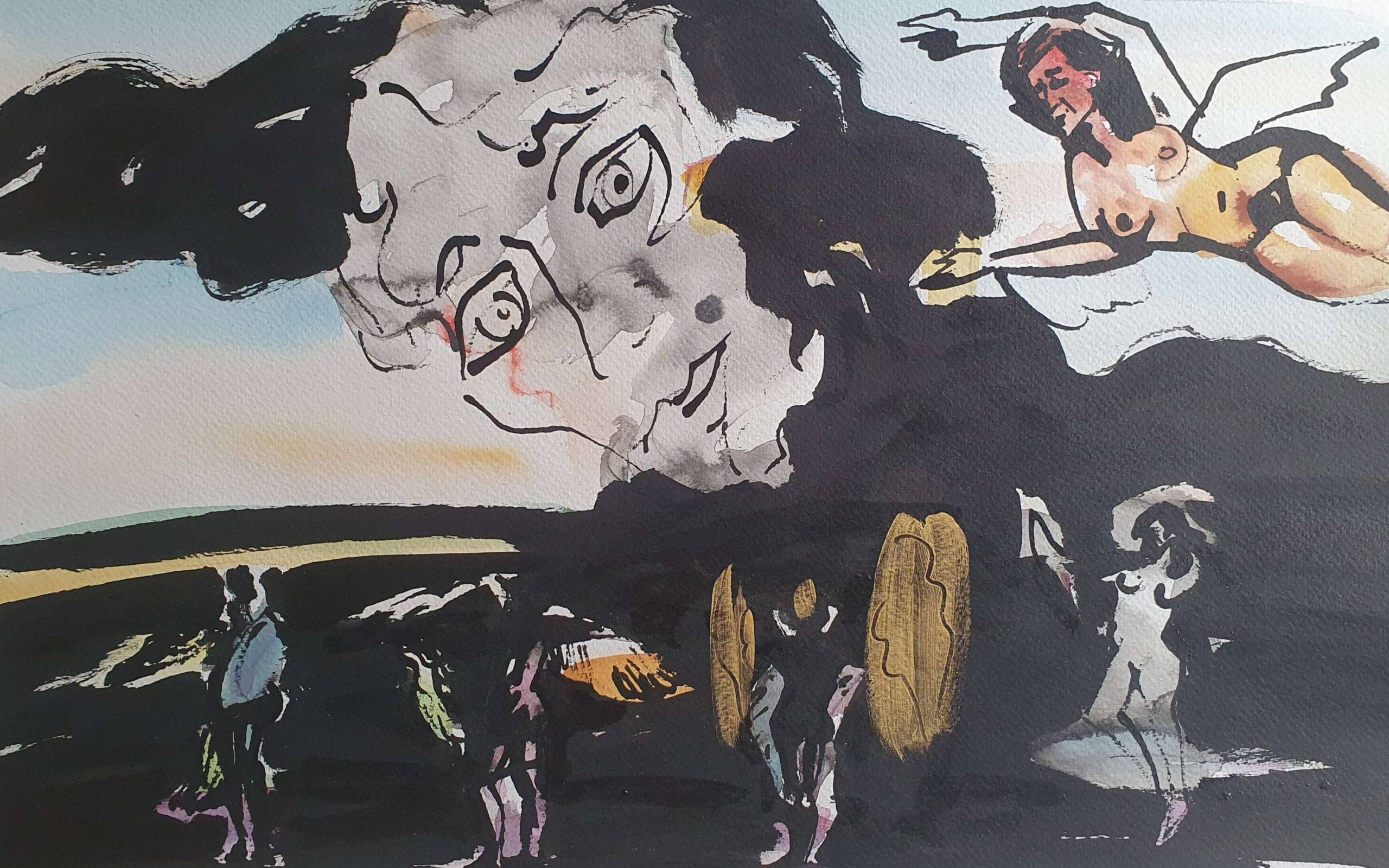 Obraz emanuje ekscentryczną mieszanką surrealistycznych kształtów i barw, które od razu przykuwają uwagę. Dominują przytłumione kolory, jak ciemne czernie i delikatne odcienie szarości, przełamane ciepłymi, złotymi akcentami i subtelnymi pastelami. Kompozycja jest chaotyczna, a na pierwszy plan wysuwa się ogromna, lekko zdeformowana twarz, unosząca się w chmurach. Z boku, niczym z baśni, pojawia się postać ze skrzydłami, przypominającą anioła. Atmosfera obrazu jest tajemnicza i trochę mroczna, jak sen, z którego nie do końca chcemy się obudzić. Styl artysty, pełen swobodnych pociągnięć pędzla, balansuje na granicy rzeczywistości i fantazji, dając wrażenie płynności i dynamiki. Można poczuć, że to wręcz "dreamlike". Obraz może wywołać uczucie niepokoju, a jednocześnie fascynacji, prowokując do refleksji nad naturą podświadomości. Osobiście, patrząc na to dzieło, czuję się jakbym wchodził do magicznego świata, gdzie wszystko jest możliwe. I o, patrzcie, fruwający ludzie! Czuję, że można się w nim zatracić, odkrywając ukryte historie i emocje skrywane pod warstwami farby.