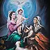 Obraz przedstawia poruszającą scenę religijną z dominującymi barwami błękitu, zieleni, różu i brązu. Na pierwszym planie widać postacie trzymające dziecko, które z ufnością spogląda przed siebie. Centralne miejsce zajmuje kobieta ubrana w różową szatę, a obok niej dziecko trzymające krzyżyk. Obraz emanuje spokojem i tajemnicą, jakby czas zatrzymał się w tej chwili. Mówiąc o stylu, artysta zastosował subtelną grę światła i cienia, by podkreślić głębię emocji na twarzach bohaterów. W tle gołąb na niebie rozświetla scenę, przyciągając wzrok. Dziecko w żółtej szacie przykuwa uwagę swoją niewinnością i ciekawością. Zaskakujące jest, jak jeden element - krzyż, przyciąga wzrok i nadaje obrazowi religijne znaczenie. Te chrześcijańskie symbole i styl nawiązują do klasycznych przedstawień biblijnych. Uczucia, jakie wywołuje ta scena, to mieszanka podziwu i refleksji nad duchowym wymiarem życia. Wow, jak ładnie tu jest, powiedziałby siedmiolatek, wskazując na owieczkę u stóp postaci. Patrząc na obraz, odkrywam, że artysta łączył tradycję z nowatorskim podejściem, osiągając magiczny efekt "aura". Jest w tej pracy coś porywającego, co sprawia, że chce się zatrzymać na chwilę i w ciszy podziwiać tajemniczość tej chwili.