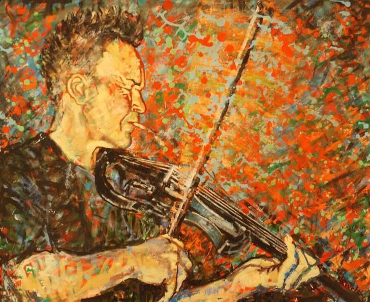 Na obrazie widać postać grającą na skrzypcach, zanurzoną w wirze kolorów. Paleta barwna jest żywa, z dominacją ciepłych odcieni pomarańczu, czerwieni i zieleni, przypominających jesienny krajobraz. Kompozycja jest dynamiczna, z powtarzającymi się wyrazistymi pociągnięciami pędzla, które tworzą efekt ruchu. Atmosfera obrazu jest intensywna i energetyczna, emanująca muzycznym rytmem i pasją. Styl artysty przypomina action painting, z widocznymi wpływami ekspresjonizmu. Technika jest swobodna, trochę jakby artysta z artystycznym "splash" oddał emocje na płótnie. Patrząc na tę scenę, można poczuć siłę i emocje płynące z muzyki. Dzieło może poruszać widza, wywołując cieple i energiczne wrażenia. Jakby ten moment, kiedy wszystko inne przestaje mieć znaczenie, a liczy się tylko dźwięk i ekspresja. "Ja też tak umiem grać" – mogłoby powiedzieć dziecko widząc ten dynamiczny spektakl kolorów i ruchu. Opis tego obrazu jako "powerful" dobrze oddaje jego energię. Ta eksplozja kolorów, dynamika i pasja mogą zainspirować każdego, kto spojrzy na tą scenę. To takie cudowne, że sztuka potrafi opowiadać historie bez słów.