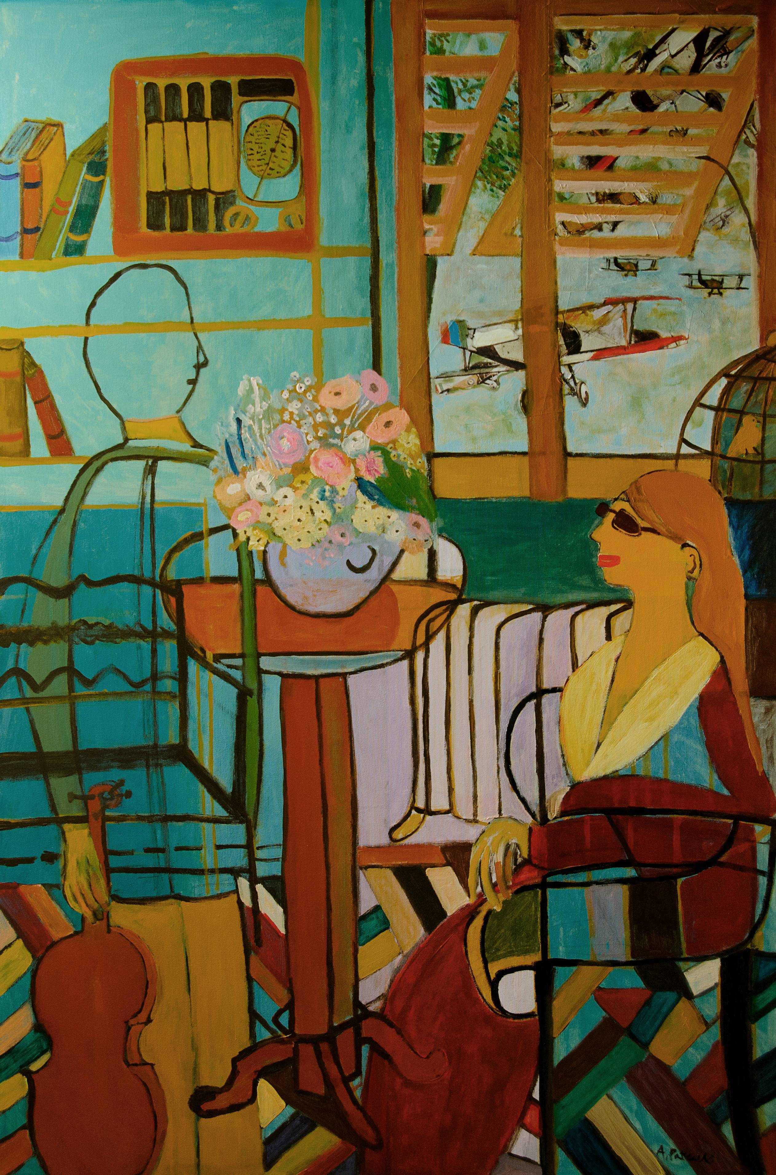 Obraz emanuje kalejdoskopem barw, dominującymi są intensywny błękit i zielenie, z kontrastującymi ciepłymi pomarańczami i złotem. Na pierwszym planie dostrzegamy postacie z ledwie zarysowanymi twarzami, otoczone kwiatami, które wydają się niemal rozkwitać w powietrzu. Centralne miejsce zajmuje stół z wazonem pełnym pastelowych kwiatów. Kompozycja jest harmonijna, ale jednocześnie dynamiczna dzięki przekornemu rytmowi linii i kształtów. Atmosfera obrazu jest nostalgiczna i pełna marzeń. Artysta świadomie używa linii, które są zdecydowane, niemal komiksowe. Jest w tym coś magicznego. Prace tego rodzaju mogą budzić w odbiorcy uczucie spokoju, ale i lekkiej tęsknoty za czasami przeszłymi. Przez okno widać samoloty, które mogą symbolizować pragnienie ucieczki albo podróży. Tak jakbym mógł wskoczyć do nich i pofrunąć gdzieś w świat. Jest to takie dreamy, wręcz hipnotyzujące. Obraz wciąga nas, proponując chwilę refleksji nad codziennością, a może i własnymi marzeniami. Czy można chcieć czegoś więcej?