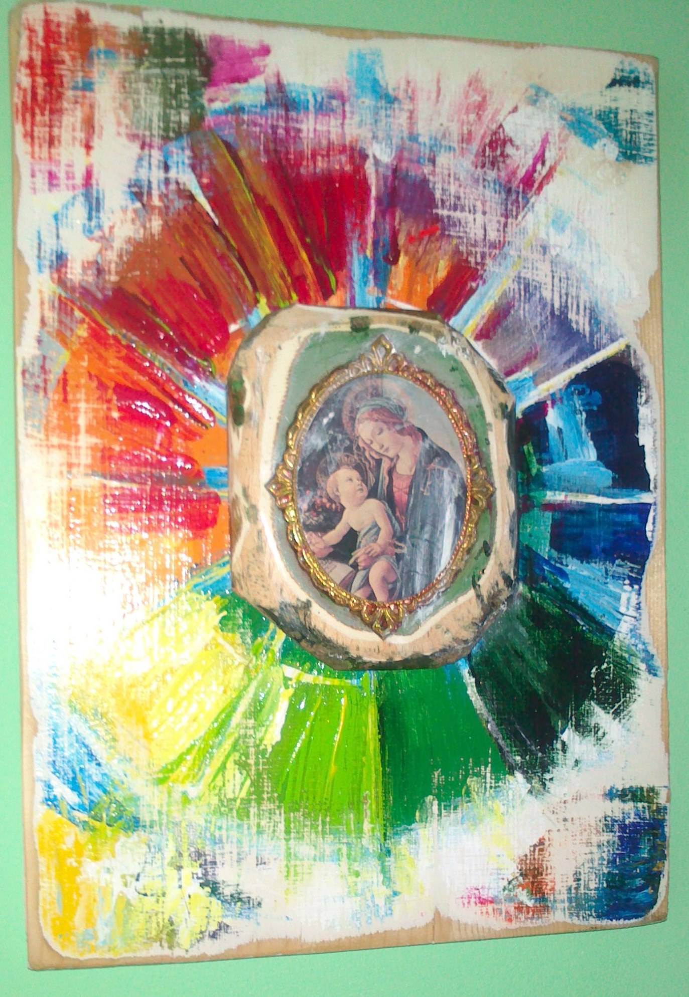 Na obrazie widać niezwykle kolorowe tło, które przypomina tęczowy wybuch farb. Żywe czerwienie, jaskrawe żółcie i głębokie zielenie splatają się w harmonii, tworząc dynamiczną kompozycję, jakby ktoś rozlał paletę emocji na płótno. Na ich środku osadzono owal z delikatnym wizerunkiem matki i dziecka, w złotej ramie, jakby wyjęty z klasycznej ikonografii. Taki kontrast – zgiełk barw i spokojna scena wewnątrz – tworzy aurę ciszy po burzy. Malarskie techniki, pewnie łącząc abstrakcję z realizmem, powodują, że obraz wydaje się "alive". Patrząc na niego, czuje się ciepło i bezpieczeństwo, jak przytulenie babci. Gdybym był dzieckiem, powiedziałbym: "W środku jest piękna bajka". To dzieło, które nastraja do refleksji nad codziennym chaosem i tym, co w nas najcenniejsze. Sami zresztą widzicie, jak to działa na wyobraźnię. Czasem w życiu potrzeba takiego kolorowego zamieszania, które w końcu prowadzi do spokoju.