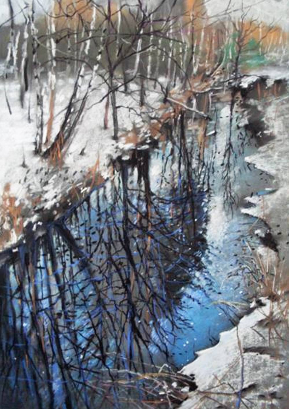 Ten obraz przedstawia zimowy krajobraz z rzeką wijącą się przez zasypane śniegiem brzegi. Dominują chłodne barwy – głęboki niebieski wody kontrastuje z bielą śniegu i ciepłymi odcieniami pomarańczowych gałęzi drzew. Kompozycja jest dynamiczna, tworzona przez linie biegnących pędów i refleksy w wodzie. Atmosfera spokoju miesza się z surowością zimowej scenerii, tworząc poczucie nostalgic contemplation. Widać tu zręcznie zastosowaną technikę malarską, gdzie artysta bawi się światłocieniem, uwidaczniając fakturę śniegu i gładkość tafli wody. Dla mnie to jak wejście do cichego, zamyślonego świata natury. Małe dziecko powiedziałoby: "Drzewa są jak patyczki w malutkim stawie!" Ten obraz może budzić w odbiorcy różnorodne emocje – od spokojnego ukojenia po melancholię chwili zatrzymanej w czasie. Jest trochę jak piękna karta pocztowa ze wspomnieniami z zimowego spaceru.