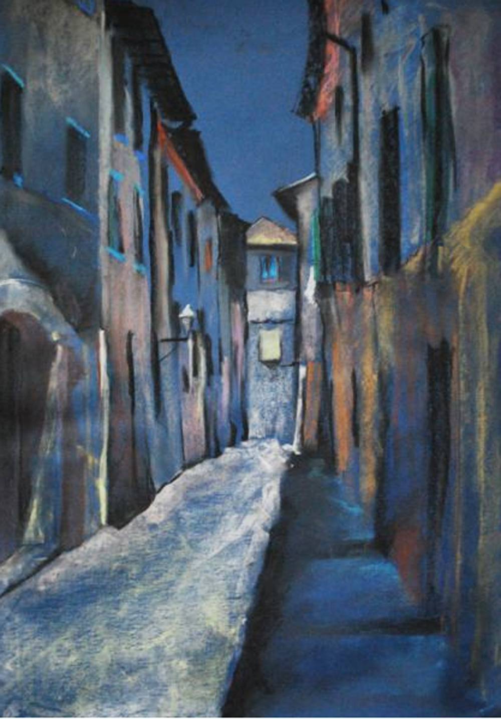 Obraz przedstawia tajemniczą uliczkę o zmierzchu. Mrok nieśmiało przenika się z bladym światłem, tworząc melodię barw. Dominuje chłodny niebieski, który nadaje pejzażowi mglisty charakter. Wąska alejka otoczona jest wysokimi budynkami, które wydają się niemal przytłaczać przechodnia. Kompozycja prowadzi wzrok w głąb, gdzie maluje się świetlista plama, jakby zapowiadająca jakiś nieuchwytny "promise" czekający na końcu. Cisza tego miejsca jest niemal namacalna, wywołuje poczucie zagadkowości i pewną nostalgię. Artystyczna technika przypomina pastel na papierze, z widocznymi fakturami oraz delikatnymi pociągnięciami, które nadają pracy dynamiki. Można odnieść wrażenie, że światło migocze, tańczy. Jak ktoś wpatruje się dłużej, może poczuć delikatny chłód nocy, jakby właśnie tam był. Ten obraz sprawia, że myślę o spacerach po opuszczonych miejscach, gdzie sekrety skrywają każde zakamarki. I myślę sobie, że chciałbym się tam zgubić, poszukać własnych tajemnic. Małe dziecko by powiedziało, że ta ulica jest jak labirynt w bajce. Kompozycja wciąga, pochłania i zostawia z pytaniem, co jest dalej za rogiem. Nie wiem jak Wy, ale ja czuję jakbym śnił na jawie.