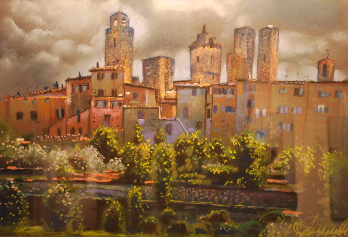 Na obrazie widzimy malownicze, stare miasto z dominującymi wieżami, które wznoszą się dumnie pod zachmurzonym niebem. Budynki ciepłych, ziemistych kolorów, takich jak brązy i złamane czerwienie, tworzą gęstą, niemal przytulną kompozycję. W dole rozciąga się zieleń, pełna rozbłysków światła, jakby cała natura próbowała złapać oddech przed nadciągającą burzą. Atmosfera tego obrazu jest pełna tajemniczości i spokoju, jakby miasto zatrzymalo się na chwilę, czekając na coś nieuchwytnego. Styl artysty, z miękkimi przejściami i subtelnymi pociągnięciami pędzla, przywodzi na myśl impresjonistyczne techniki. Czujemy lekkość powietrza, ale także pewną ciężkość chmur. Patrząc na obraz, widzę przygody, które mogłyby się tu wydarzyć. Dla dziecka to może być magiczne królestwo. "To miasto wygląda jak z bajki!" powiedziałoby 7-letnie dziecko. Obraz może wywoływać uśmiech, ale i zadumę nad upływającym czasem. Widać tu echo historycznej mocy i beauty minionych lat.