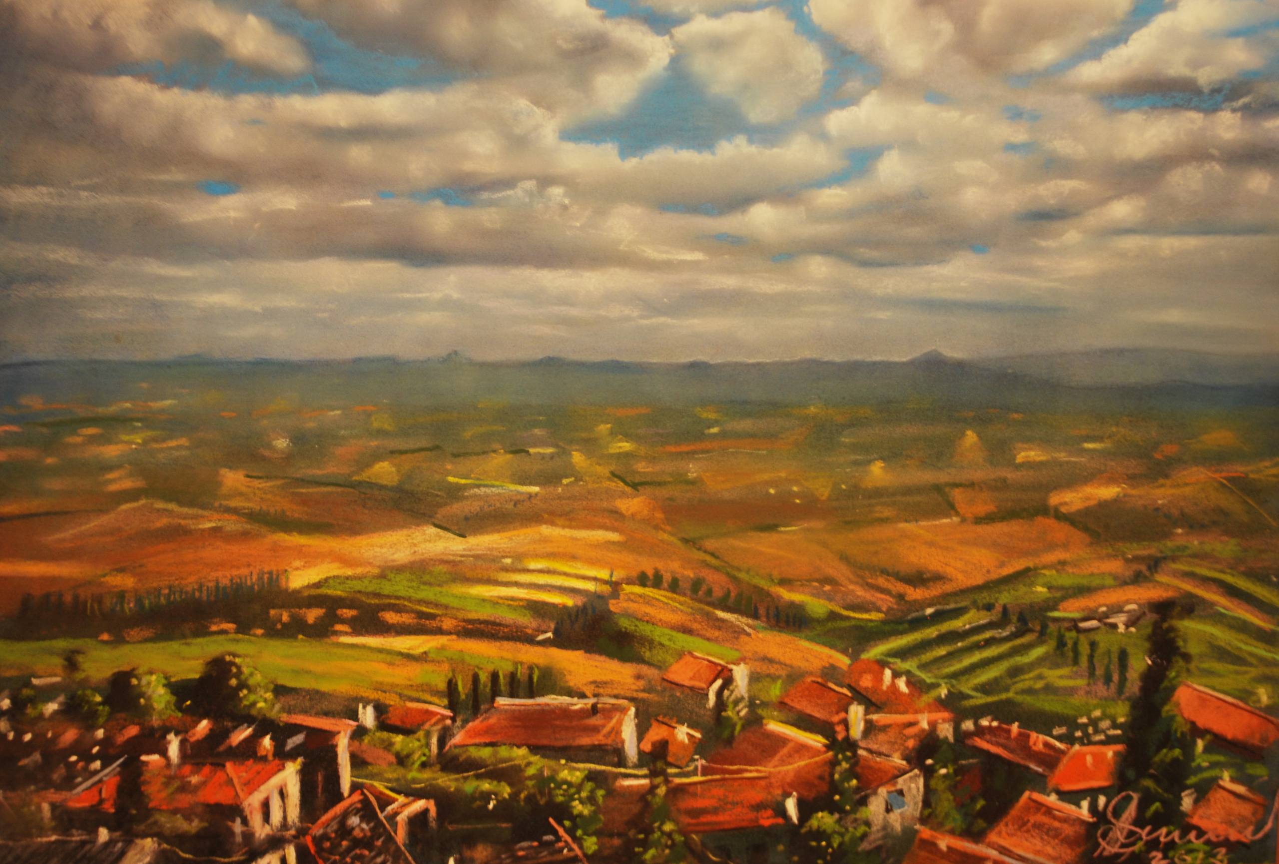 Sielski krajobraz rozciąga się aż po horyzont, a jego ciepłe, złote i pomarańczowe odcienie nadają mu wyjątkowego uroku. Domki z czerwonymi dachami tworzą urokliwy kontrast z zielenią drzew i traw, prowadząc wzrok poprzez falujące wzgórza. Chmury na niebie unoszą się leniwie, rzeźbiąc subtelne granice między błękitem a białym. To jakby obraz wakacyjnej pocztówki, z atmosferą spokoju i marzeń. Artysta, sięgając po techniki impresjonistyczne, uchwycił światło i cienie z niezwykłą precyzją, nadając kompozycji lekkości. Malując widoczki i zakamarki wsi, wzbudza w odbiorcy tęsknotę za niezmąconą naturą. To jak patrzenie na idylliczny świat, w którym czas płynie wolniej, a troski dnia codziennego wydają się odległe. Dzieło to emanuje ciepłem i pogodą ducha. Czuję jakby promienie słoneczka muskały twarz, wywołując uśmiech. Patrząc na nie, chciałoby się powiedzieć: "Wow, jaki piękny krajobraz!" Malarska paleta, pełna żywych kolorów, przemawia do wyobraźni, a różnorodność faktur skłania do poszukiwań nowych szczegółów za każdym spojrzeniem. Ta scena wydaje się jak perfect escape od nudnej rzeczywistości.