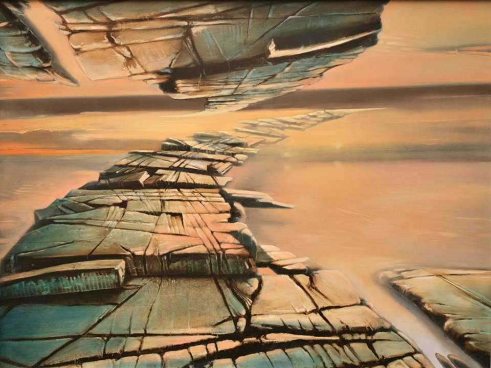 Obraz przedstawia intrygującą, surrealistyczną krainę pełną tajemnicy i spokoju. Dominuje paleta pastelowych, delikatnych barw — odcienie beżu, błękitu i zieleni. Takie kolory jakby zachęcają nas do zanurzenia się głębiej w świat przedstawiony na płótnie. Geometryczne formy przypominające skrystalizowane skały tworzą dynamiczną kompozycję prowadzącą wzrok widza ku dalekiemu horyzontowi. Czy te skały unoszą się w powietrzu, czy to tylko iluzja? Naprawdę, czuje się tu obecność czegoś magicznego. Atmosfera jest pełna ciszy i refleksji. Każda linia, każdy kolor ma swoje znaczenie, które artysta skonstruował jak puzzle. Styl artystyczny sugeruje wpływ surrealizmu z elementami abstrakcji. Artysta zastosował techniki, które nadają obrazowi iluzorycznej głębi i przestrzeni. Wrażenie ruchu i zmian rozbudza ciekawość. Kiedy na to patrzę, przypomina mi się opowieść o niekończącej się podróży. Interesujące, prawda? What a mystery! Widz może czuć się zafascynowany lub nawet odrobinę zagubiony. To jakby wejść w sen, gdzie nic nie jest oczywiste. „Ten obraz wygląda jak gigantyczna układanka!” – czyż to nie słowa, które mogłoby wypowiedzieć dziecko? To dzieło skłania do zatrzymania się i refleksji nad nieskończonością przestrzeni. Na pewno powoduje emocjonalne drgnienia, jakbyśmy byli częścią jego własnej magii.
