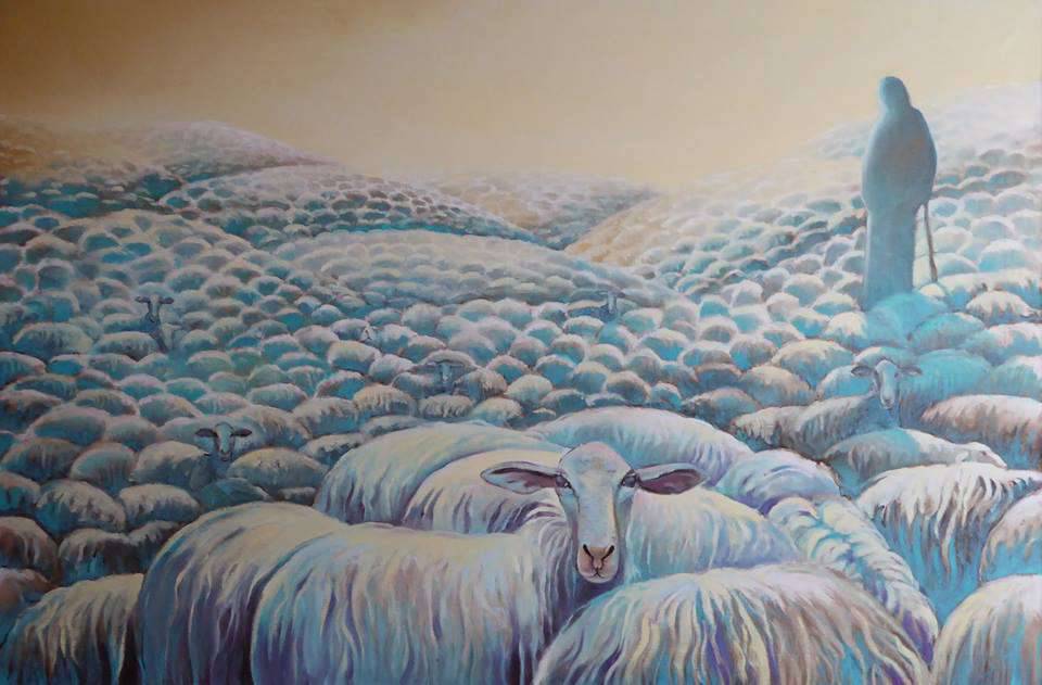 Na obrazie widzimy spokojne stado owiec, które rozciąga się aż po horyzont, tworząc łagodne fałdy przypominające puszyste chmury. Dominują tu miękkie odcienie błękitów i bieli, które nadają kompozycji delikatności i uspokajającego nastroju. Na pierwszy plan wybija się jedna owca, której czujne spojrzenie zdaje się spotykać nasz wzrok. W oddali, jak duchowy strażnik, stoi postać pasterza – zarysowuje się ona w pastelowych, niemal eterycznych barwach. Styl obrazu jest subtelny, lekko impresjonistyczny. Artysta mistrzowsko używa techniki światłocienia, by stworzyć wrażenie głębi. Patrząc na to dzieło, serce wypełnia się spokojem. To jak wizyta w krainie snów, gdzie wszystko jest "cool" i na swoim miejscu. Mógłbym wpatrywać się w to godzinami, lecz mały Tomek powiedziałby, że te owce wyglądają jak wata cukrowa. Malarski pejzaż roztacza aurę błogości, zachęcając do zatrzymania się na chwilę refleksji. Czuć tu ciszę poranka, gdzie słychać jedynie szum wiatru. Artysta uchwycił coś magicznego w tej rzeczywistości – spokój, który każdy pragnie odnaleźć.