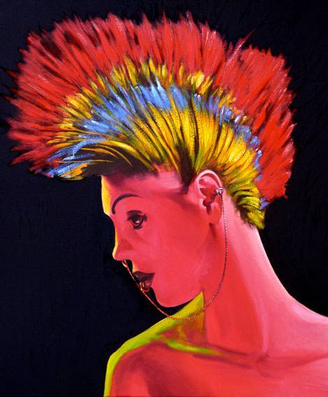 Obraz przedstawia dynamiczny portret osoby z kolorowym irogowym fryzem, który eksploduje mieszanką ognistej czerwieni, jasnej żółci i głębokiego błękitu. Uwagę przyciąga kontrast pomiędzy ciemnym tłem a żywymi, niemal neonowymi kolorami włosów. Kompozycja kieruje wzrok widza w stronę profilu twarzy, subtelnie oświetlonego i odwróconego ku dołowi. Całość ma w sobie coś z energii i buntu charakterystycznego dla subkultury punkowej. Atmosfera obrazu jest intensywna, tętniąca życiem, może nawet nieco prowokacyjna. Artysta zastosował technikę olejną, co widać po grubo nałożonych warstwach farby i wyraźnych pociągnięciach pędzla, które dodają tekstury i głębi. Styl obrazu można określić jako ekspresyjny i nowoczesny. Patrząc na to dzieło, można poczuć się jak na koncercie punkowym, gdzie „energy” bije z każdej strony. Ta kolorowa eksplozja na płótnie budzi w odbiorcy uczucia wolności i odrobinę szaleństwa. Dla niektórych może symbolizować siłę wyrażania siebie. A Julia powiedziała, że to wygląda jak tęcza na głowie. Osobiście, czuję jakby ten obraz mówił: „żyj pełnią życia i nie bój się być innym”. To dzieło, które na pewno przyciąga wzrok i dodaje energii każdemu, kto na nie spojrzy.