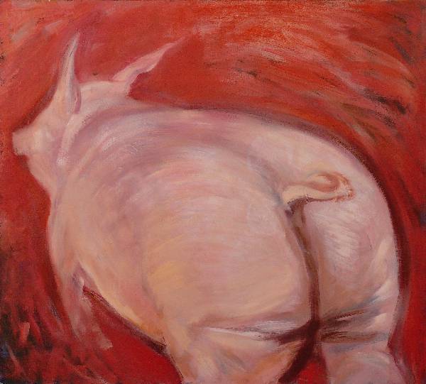 Obraz przedstawia zaskakujące ujęcie świni, której sylwetka dominuje na pierwszym planie. Tło pulsuje intensywną czerwienią, dodając dynamiki i nieco niepokojącej energii całej kompozycji. Światło miejscami przechodzi w ciepłe różowe tony, co stwarza efekt miękkości. Wyraźne pociągnięcia pędzla sugerują żywotność zwierzęcia, mimo że widzimy je z niecodziennej perspektywy. Atmosfera tego obrazu jest... no, jakby to powiedzieć, nieco absurdalna. Wyobraź sobie ciepłe letnie popołudnie, a tu nagle – świnia na czerwonym tle. To trochę surrealistyczne doświadczenie, prawda? Techniką, którą posłużył się artysta, jest olej na płótnie, co pozwala na bogactwo faktur. Patrząc na ten obraz, można poczuć pewną nostalgię. Albo nawet delikatny niepokój. Może chodzi o to, żeby spojrzeć na zwykłe rzeczy z innej strony, odczuwając zaskoczenie, a czasem zawstydzenie. Kolorystyka, mieszając się ze sobą, tworzy poczucie ruchu. Obraz mówi: "Hej, nie bierz wszystkiego na poważnie, life is unexpected!" Dziecku mógłbym powiedzieć: "Świnka wygląda, jakby szukała zgubionego ogonka". To takie dziecinne, ale zarazem bardzo celne spostrzeżenie. Ta praca na pewno wywołuje uśmiech, ale i skłania do refleksji nad wyglądem codzienności. Czasem warto dostrzec sztukę tam, gdzie najmniej się jej spodziewamy.