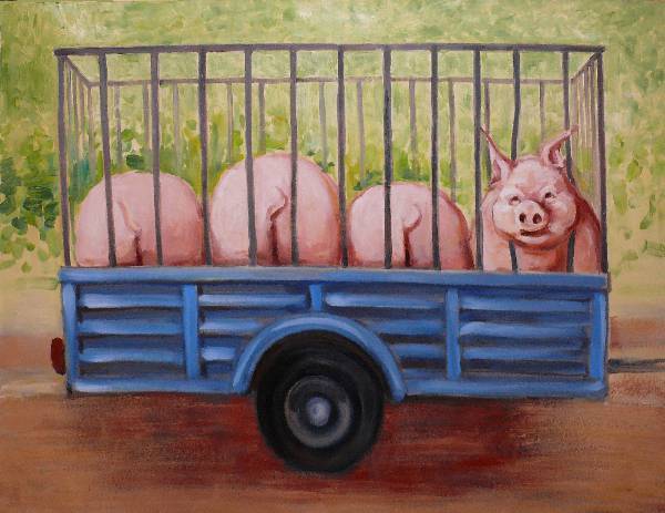 Na obrazie widzimy przyczepę wypełnioną trzema dużymi, różowymi świnkami, które zwrócone są do nas swoimi pękatymi, zaokrąglonymi zadem. Wszystko to otacza zielona sceneria, stanowiąca tło dla tego zabawnego ujęcia. Czwarta świnka, spoglądająca w naszą stronę z szerokim uśmiechem, zdaje się być najbardziej zadowolona z całej grupy. Urocza kompozycja skupia się na mocnym kontraście między pastelowym odcieniem niebieskiego metalowego ogrodzenia a jasnym różem świń. Atmosfera obrazu jest lekka i humorystyczna, emanacja beztroski w najczystszej postaci. Artysta zastosował technikę olejną, z delikatnymi pociągnięciami pędzla, co dodaje miękkości i zachęca do przyjrzenia się szczegółom. Patrząc na tę scenkę, czujesz jakbyś był na wsi, w powietrzu unosi się zapach trawy. Jakby ktoś powiedział "simple joys", to by pasowało. Patrząc na tę zadowoloną świnkę, człowiek nie może się nie uśmiechnąć. Może to przypomnienie, by cieszyć się małymi rzeczami? Ciekawe, czy kiedyś przyjdzie do mnie do domu. Świetny przykład, jak w prostocie tkwi siła przekazu sztuki.