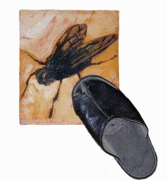 Obraz przedstawia komiczną scenę z dużym malunkiem muchy na tle beżowej kartki, po której spoczywa czarny, skórzany kapeć. Kolory zdają się żywe, z dominującymi odcieniami czerni i brązu na tle delikatnego, pastelowego pomarańczu. Kompozycja jest prosta, ale pełna ironii. Przyciąga wzrok absurdalnym zestawieniem codzienności z artystycznym zacięciem. Artysta użył swobodnych pociągnięć pędzlem, co nadaje dziełu lekko stylizacji street artu. Atmosfera jest lekka, zabawna i nieco nonszalancka, jakby ktoś chciał "rozwiązać" problem muchy z przymrużeniem oka. Kto nie zna tego momentu, kiedy muchy latają? Ten obraz to uśmiech w codziennym szarym dniu. Przywołuje wspomnienie letnich dni, gdy ten drażniący owad zakłócał spokój. Stylistycznie, dzieło łączy elementy surrealizmu z codziennym doświadczeniem, a zastosowanie humoru wyróżnia się na tle innych prac. Obraz może wywoływać śmiech lub zaskoczenie – takie "what a surprise!" uczucie. Personalnie, ten obraz przypomniał mi dzieciństwo, kiedy oglądałem, jak rodzice próbują pozbyć się much. Artysta poprzez prostotę i dowcip zaprasza do refleksji nad naszymi błahymi zmaganiami.