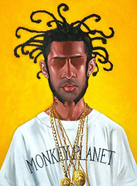 Obraz przyciąga uwagę swoją żywą kolorystyką. Dominującym kolorem jest intensywna żółć tła, która kontrastuje z ciemniejszymi odcieniami postaci. Postać na obrazie ma wyraziste rysy, wyjątkowe fryzurę z kręconymi warkoczykami przypominającymi gałązki, co dodaje dynamiki i intrygi. Na koszulce widać napis "Monkey Planet", który może budzić skojarzenia z popkulturą. Krótkie chwile zastanowienia nad przesłaniem tego obrazu mogą prowadzić do ciekawych refleksji, czy to przypadkowy wybór, czy coś więcej. Atmosfera dzieła jest niecodzienna, wręcz surrealistyczna. Artysta wykorzystał technikę kontrastu, co dodaje głębi i mocno akcentuje centralną postać. Wyraz twarzy jest zagadkowy, trochę buddy-like, z lekkim grymasem, ale też spokojem. Czuć tu pewien dystans do świata, jakby postać była w swoim świecie – in her own world. Można poczuć, że obraz igra sobie z odbiorcą, próbując wzbudzić emocje takie jak ciekawość, a nawet lekki niepokój. Styl artystyczny jest nowoczesny, z elementami ekspresjonizmu. Choć forma jest prosta, widać w niej pewną nonszalancję, jakby artysta chciał powiedzieć coś ważnego, ale jednocześnie zostawić to do naszej interpretacji. Kiedy patrzę na ten obraz, myślę, że artysta nie boi się prowokować i bawić się formą. Każdy element wydaje się być na swoim miejscu, ale jest tu miejsce na pewien chaos, który przyciąga wzrok. Obraz ten zmusza do zatrzymania się i zastanowienia. Pomyślałam sobie: "ale fajne włosy". Taka sztuka ma zdolność wciągania odbiorcy w głąb swojej narracji.