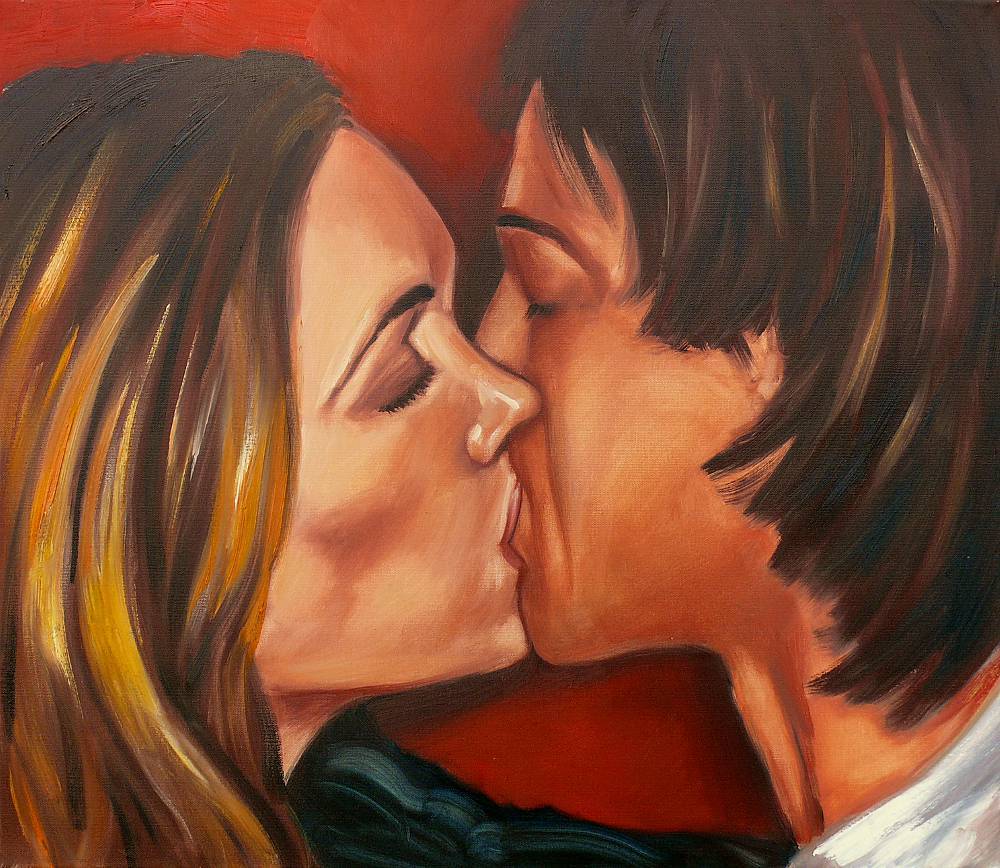 Na obrazie widzimy parę w intymnym momencie pocałunku. W centrum kompozycji znajdują się zblakłe ciepłe barwy – głównie odcienie brązu, złota i czerwieni. Te kolory przyciągają uwagę i tworzą przyjazną, radosną atmosferę, która tętni życiem i emocjami. Tło obrazu jest całkowicie czerwone, co jeszcze bardziej podkreśla intensywność chwili i dodaje dramatyzmu całości. Artysta zastosował technikę szerokich pociągnięć pędzla, co nadaje dziełu dynamiki i spontaniczności. Istnieje tu pewna nonszalancja, która sprawia, że obraz oddziałuje na nas, jakbyśmy byli świadkami czegoś prawdziwego i ulotnego. "Wow, oni się całują, mamo!" - można by było usłyszeć głos dziecka patrzącego na ten obraz. Ta scena może wywoływać poczucie ciepła, miłości i bliskości. Jest też coś pięknego w tym prostym geście – niesie on ze sobą uniwersalną prawdę o potrzebie miłości. To painting doskonale uchwyciło moment prawdziwej bliskości, który jest zarówno old-school, jak i nowoczesny w swojej szczerości. Czyż nie mamy czasem ochoty zanurzyć się w takiej chwili i zatracić w prostocie uczuć? Ten obraz niewątpliwie zostawia widza z uśmiechem na twarzy i tęsknotą w sercu.