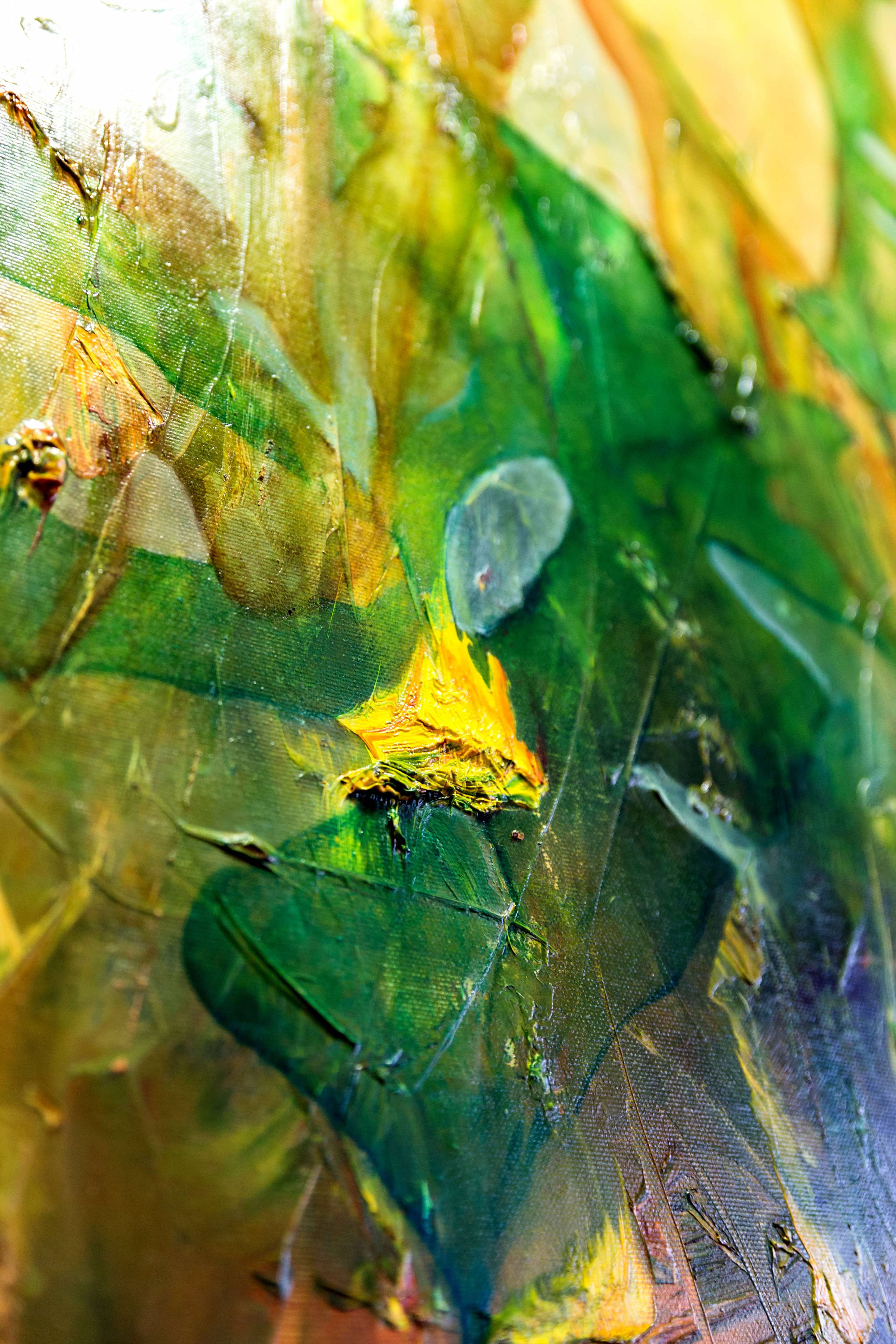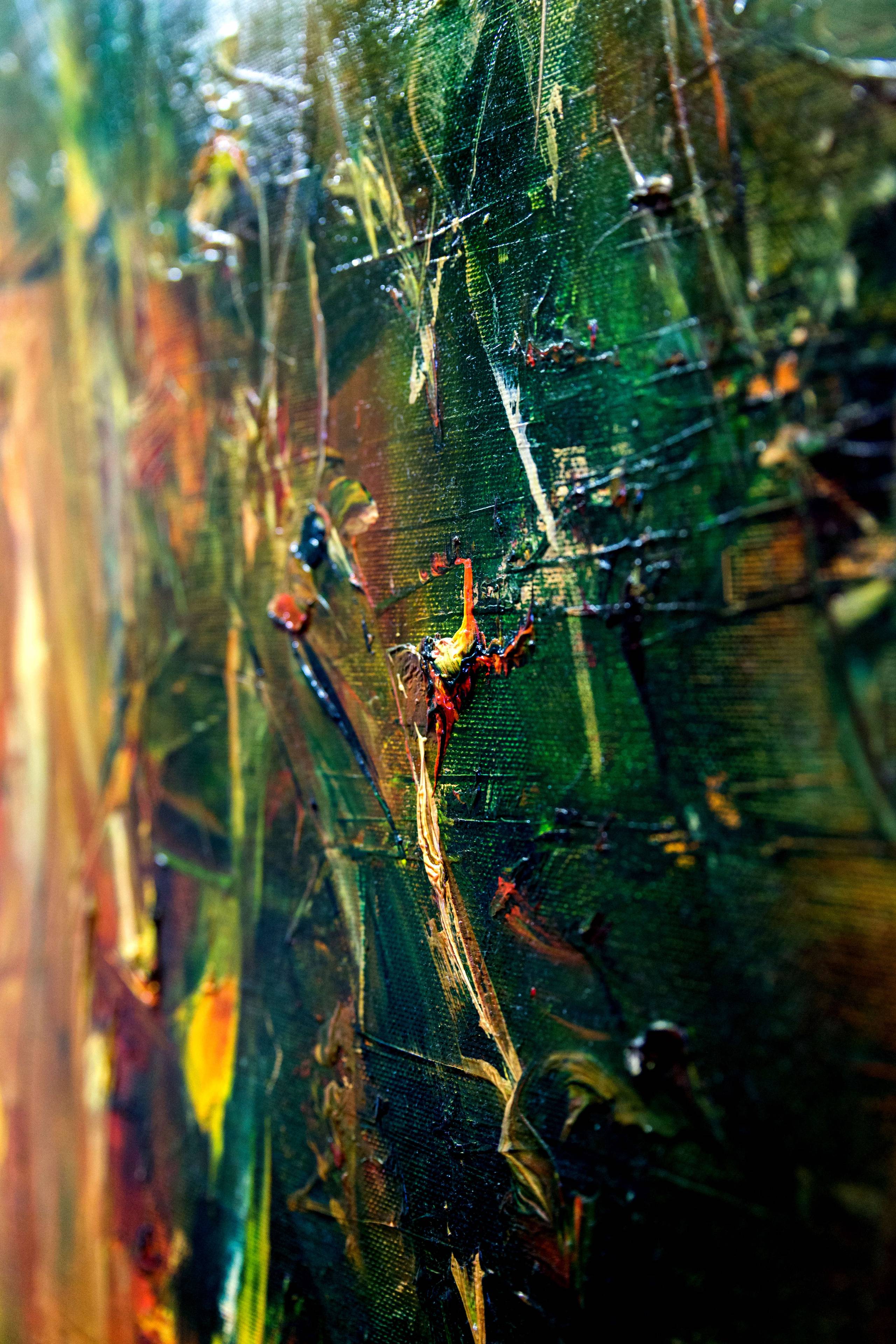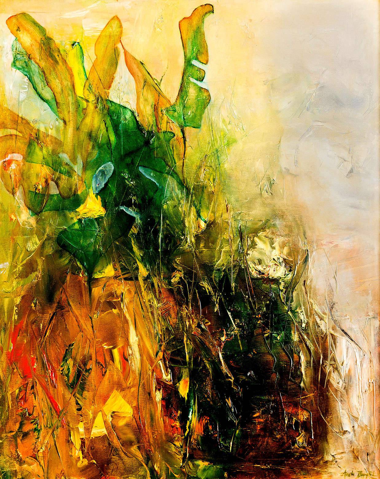 Sygnowany, datowany i opisany na odwrocie: Aneta Barglik 'Emerald Garden' 2018. Obraz olejny, zamalowane boki , naciągnięty na blejtram, Obraz malowany na płótnie. . Praca wernisażowa, wystawiana w Galerii Filharmonii Opolskiej, Opole, 'Obecność. Obraz znajduje się w Passe-partout i złotej ramie tak zwane 'kostce', idealnie pasujące do nowoczesnych obrazów. co zwiększa rozmiar obrazu z 80x100 cm na 99x119cm.