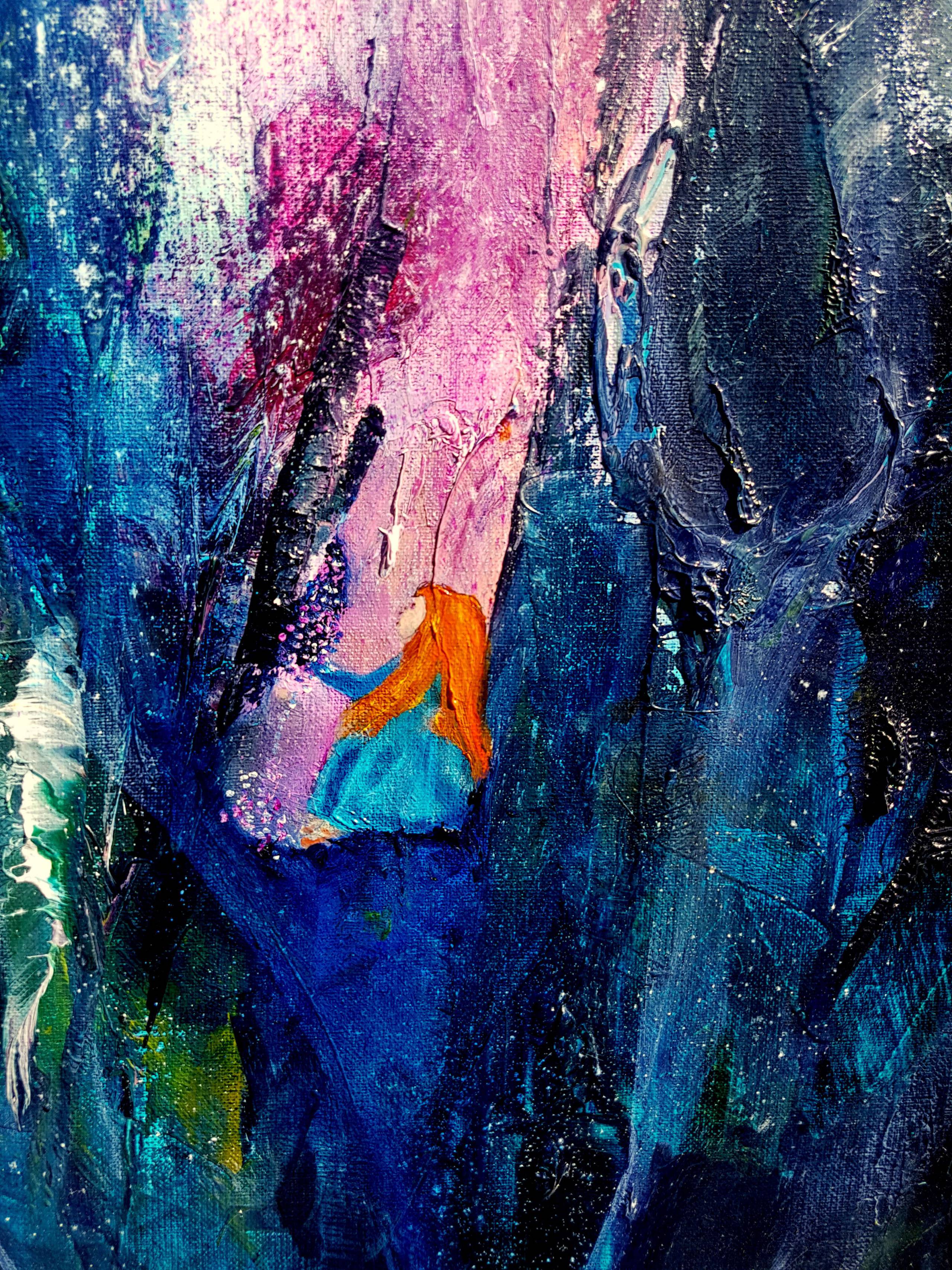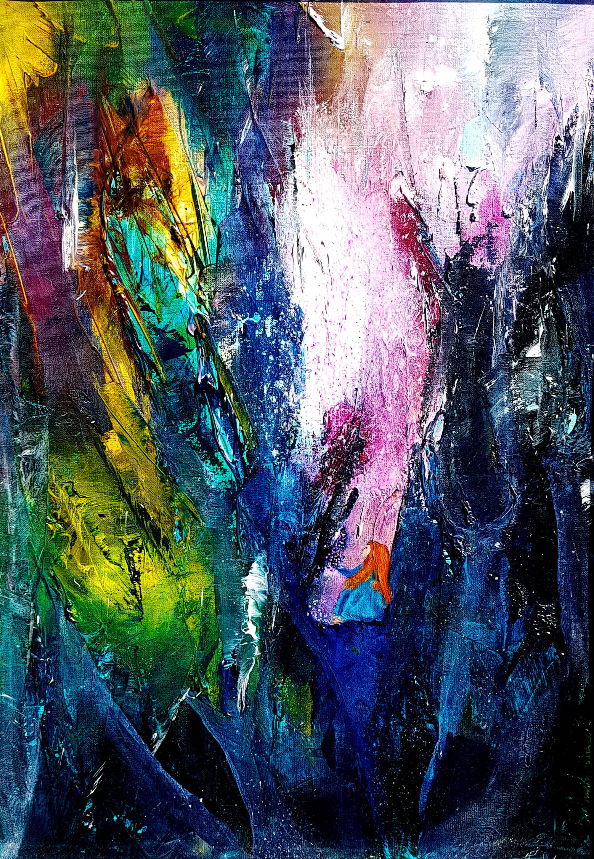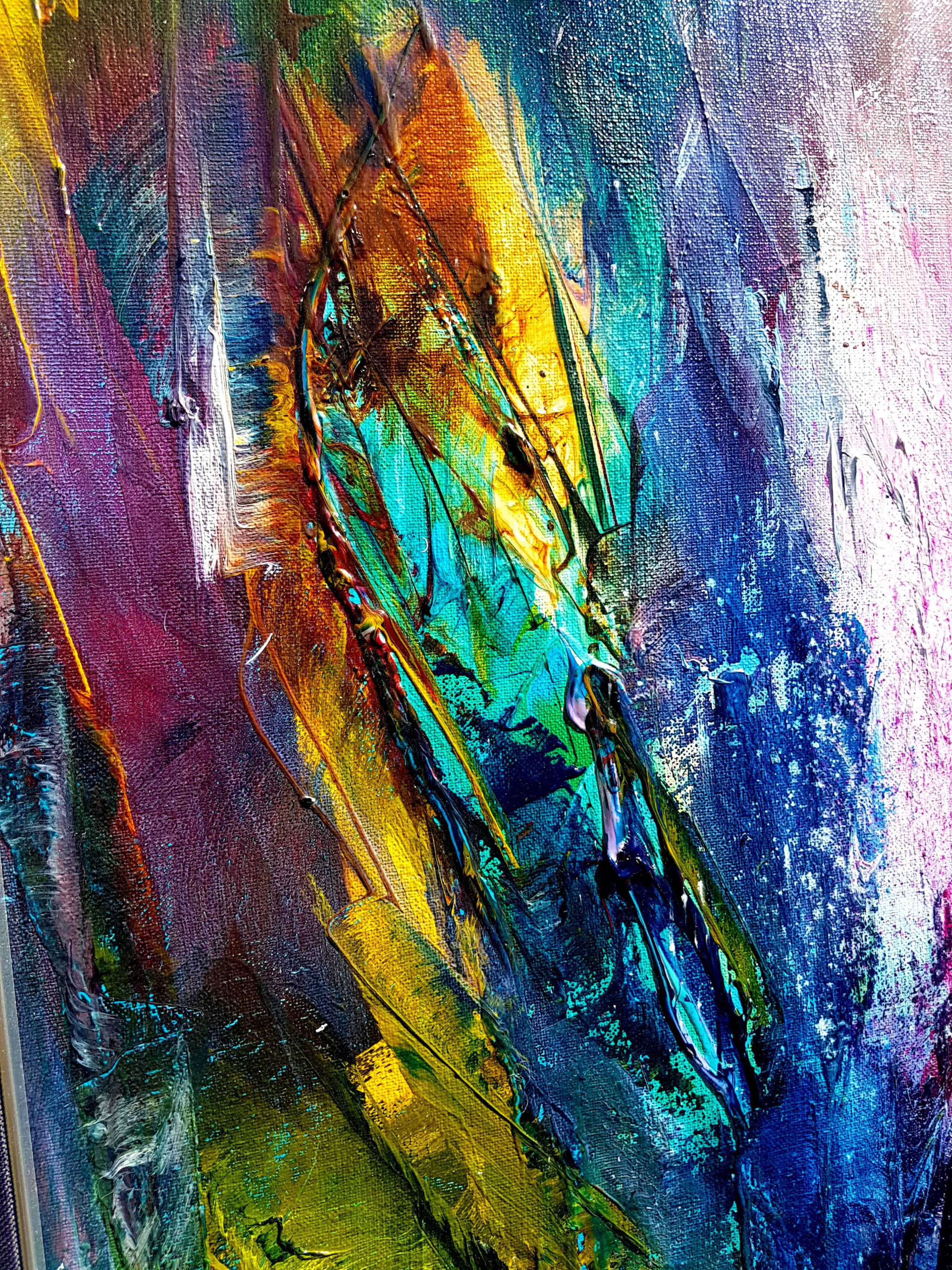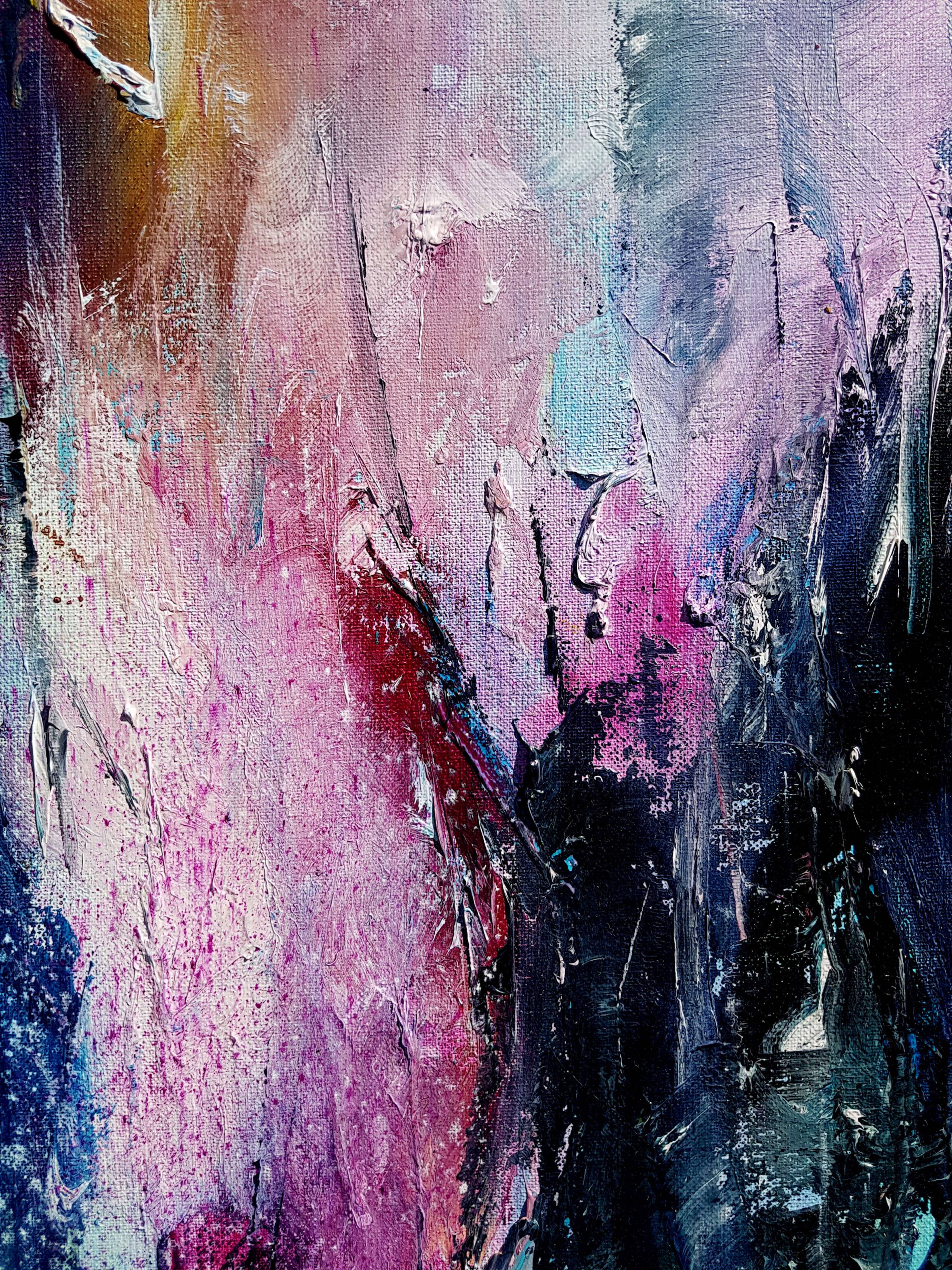 Sygnowany, datowany i opisany na odwrocie: Aneta Barglik 'Wszystko o czym mogę pomyśleć' 2019. Obraz olejny, zamalowane boki , naciągnięty na blejtram, Obraz malowany na płótnie. . Obraz o wymiarach 50 szer x 70 wys., oprawiony w passe-partout i zamknięty piękną szarą nowoczesną ramę, co zwiększa wymiary do 66 szer. x 86 wys. gotowy do powieszenia. Praca wykonana techniką własną w oleju , kolor kładziony raz grubo szpachlą, to znów ledwo muśnięty pozostawiający ślad włosia.