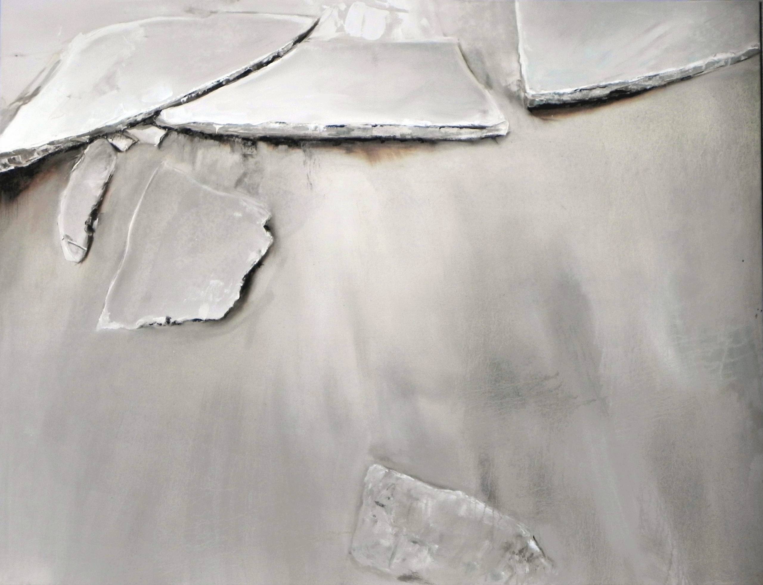 Obraz emanuje spokojem i surowością. Dominują odcienie szarości i bieli, tworząc delikatny kontrast między fragmentami nieregularnych płyt a gładkim tłem. Rozłożone w misterny sposób, przypominają połamane kawałki lodu dryfujące po zamarzniętym jeziorze. Kompozycja jest minimalistyczna, ale nie pozbawiona głębi, co nadaje dziełu dynamiczny yet subtelny charakter. Atmosfera obrazu jest chłodna i nieco melancholijna, jakby zapraszała do refleksji nad przemijaniem. Artysta zastosował techniki, które nadają płynom teksturę i realizm – widać to po nierównościach na płytach, które wydają się niemal trójwymiarowe. Dzięki temu obraz zyskuje tactile quality. Patrząc na ten obraz, można poczuć się jak w środku zimowego dnia. "To wygląda jak wielka ślizgawka!" – powiedziałby 7-latek, zachwycony lodowym światem. Dla odbiorcy może to być synonim zimowego spokoju, chwilowego zatrzymania czasu. Wpatrując się w tę kompozycję, łatwo zapomnieć o zgiełku codzienności i wsłuchać się we własne myśli. W tym wszystkim obraz zachwyca prostotą i jednocześnie zaskakuje bogactwem interpretacji. To dzieło, które skłania do zatrzymania się i zrozumienia piękna tkwiącego w prostocie.
