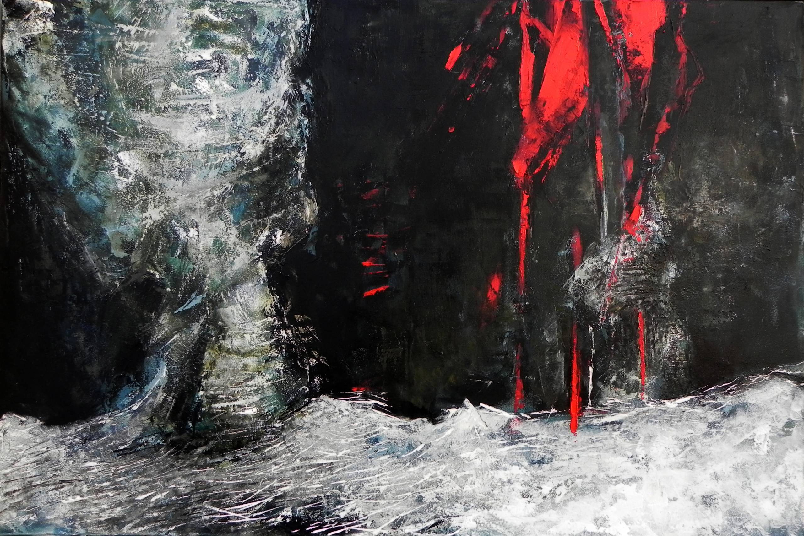Obraz emanuje swobodą abstrakcji, gdzie grube pociągnięcia pędzla tworzą dynamiczną, niemal burzliwą kompozycję. Przeważają ciemne tony czerni, które z lawinową siłą kontrastują z jaskrawymi, czerwonymi akcentami. Te intensywne czerwienie, jakby rozpryski krwi, dodają dramatyzmu. A w tle, subtelne niuanse bieli i szarości wprowadzają oddech, niczym pęd zimowego wiatru. Nastrój na obrazie jest ciężki, wręcz przytłaczający, gdzie wewnętrzny spokój zdaje się walczyć z chaosem. Artysta bawi się fakturą, nakładając farbę w sposób surowy, co potęguje efekt trójwymiarowości. Technika impasto dodaje mu głębi i charakteru. W oczy rzuca się nie tylko kolor, ale i niezwykła struktura. Patrząc na ten obraz, można poczuć mieszankę niepewności i fascynacji, jakby stało się na krawędzi czegoś niesamowicie wielkiego. To jak oglądanie burzy z bezpiecznego miejsca. Czerwone smugi, "like lightning in the dark", przeszywają obraz, pozostając na długo w pamięci. A ja myślę sobie – to takie mroczne, a zarazem piękne. Byłby to obraz, na który patrzy się długo, odkrywając za każdym razem coś nowego. Ale o co w nim chodzi? Może jak zapytasz dziecko to powie – "to tornado z czerwonym deszczem!" i może coś w tym jest. Emocje na pewno są intensywne i zmuszają do refleksji.