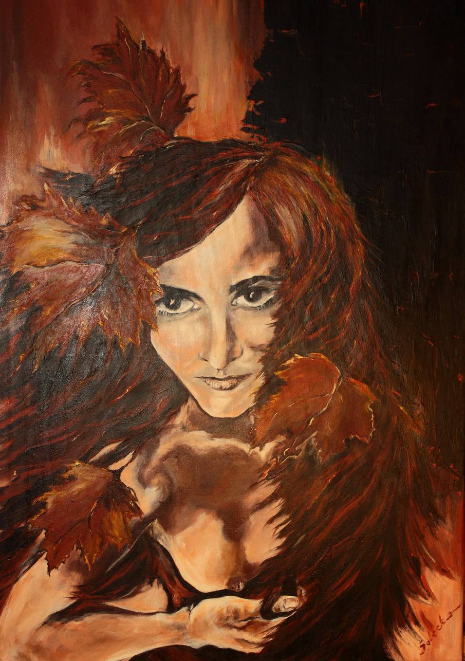 Na obrazie dominują ciepłe, ogniste barwy, które wręcz płoną intensywnością czerwieni, pomarańczu i brązu. Główna postać, tajemnicza kobieta, spogląda z płótna z przenikliwym, zagadkowym wyrazem twarzy. Jej włosy i listowie wokół niej zdają się wirować w wietrznym tańcu, tworząc dynamiczną kompozycję pełną ruchu. Atmosfera dzieła jest zarówno intrygująca, jak i pełna energii, co sprawia, że widz czuje się jak świadek magicznego rytuału. Styl malarski wskazuje na surrealizm, gdzie realistyczne elementy łączą się z fantazją. Technika pociągnięć pędzla nadaje teksturę i głębię, zwłaszcza w miejscach cienia na twarzy i liściach. Widac, że artysta użył techniki impasto, która dodaje obrazu wyrazistości. Uczucie tajemnicy pogłębia nieco mroczny nastrój dzieła, przypominając viewers, że każde spojrzenie może odsłonić coś nowego. Patrząc na ten obraz, możemy poczuć mix fascynacji i niepokoju. Czuję, że artysta celowo stawia nas w stanie zagadki. "To wygląda jak czarownica!" powiedziałoby jakieś dziecko. Obraz może skłonić odbiorców do refleksji nad zmiennością natury i nas samych, a jego enigmatyczność sprawia, że wracamy do niego myślami raz za razem.