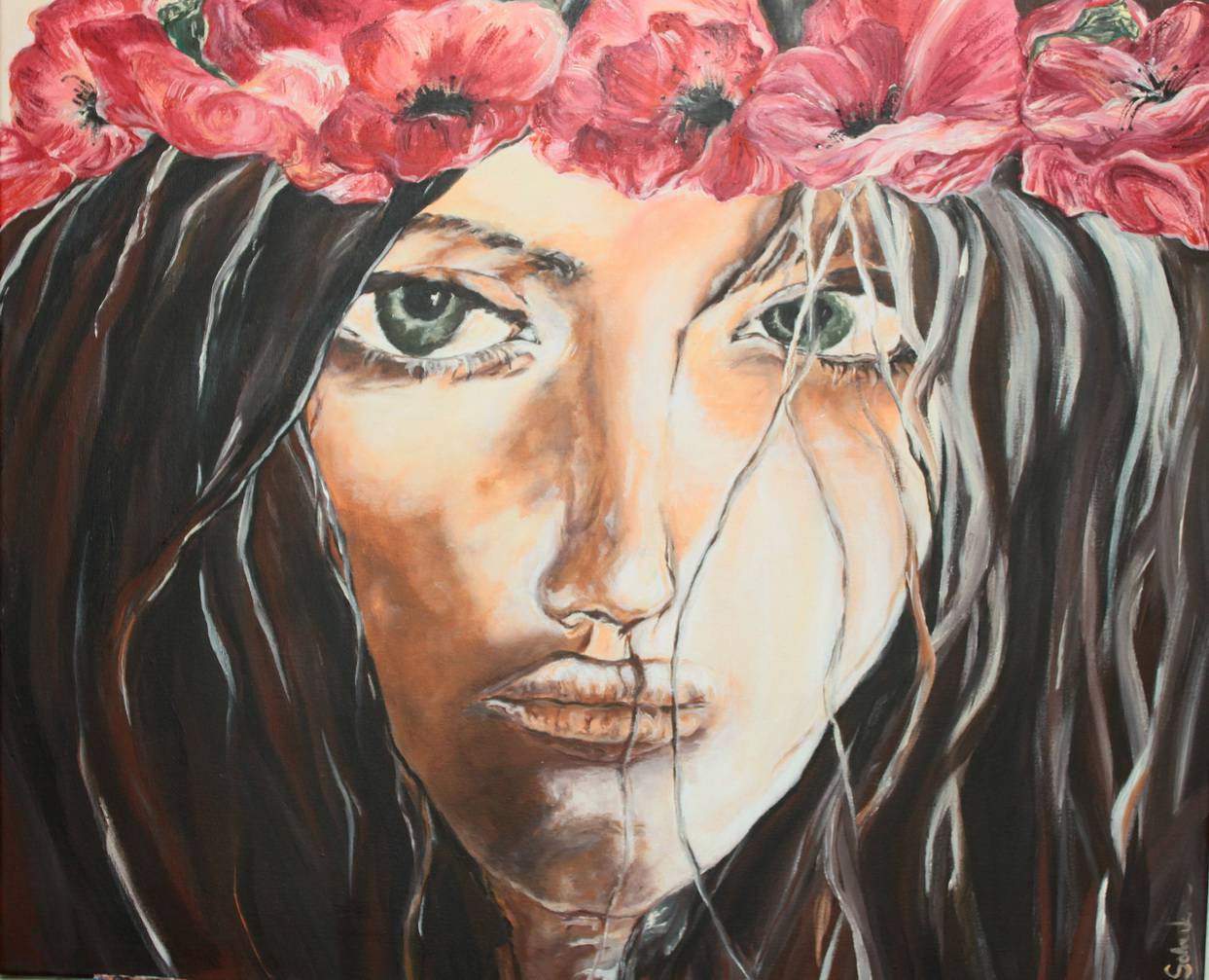 Obraz przedstawia tajemniczą postać z intensywnymi, zielonymi oczami, które zdają się przenikać widza. Twarz jest otoczona burzą ciemnych, rozwichrzonych włosów, nad którymi spoczywa efektowny wieniec z czerwonych kwiatów, przypominających maki. Te kontrastujące barwy tworzą dynamiczną kompozycję, przywodzącą na myśl zmienne nastroje ludzkiej duszy. Obraz roztacza aurę melancholii. Jest w tym czymś magicznym, jakby czas się zatrzymał. Artysta zastosował technikę malarską, która sprawia wrażenie jakby farba była rozmieszana ręką, z subtelnymi przejściami tonalnymi i wyraźnymi pociągnięciami pędzla. Emocje widza mogą się wahać od zadumy po podziw. Jest tu coś jak memory, pamięć o czymś ulotnym. Patrząc na ten obraz, można poczuć się jak w innym świecie. "Ojej, ona ma kwiatki na głowie!" – powiedziałby może mały chłopiec. Refleksja nad pięknem przemieszanego z nostalgią życia nabiera tutaj osobistego wymiaru. To dzieło nie tylko przyciąga wzrok, ale i wciąga w emocjonalną podróż, gdzie każdy szczegół wydaje się mieć swoje znaczenie.