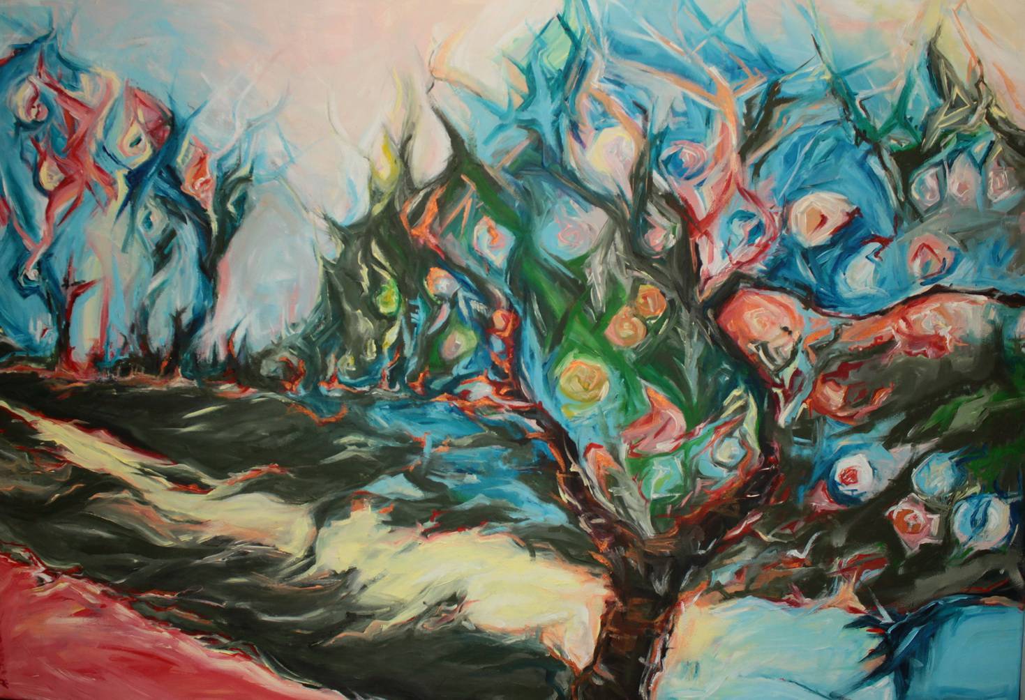 Na tym obrazie dominują dynamiczne barwy i wirujące formy. Artysta maluje krajobraz pełen nasyconych odcieni niebieskiego, zieleni, czerwieni i pomarańczy, które wydają się tańczyć na płótnie. Linie są chaotyczne, a kształty niejednoznaczne, co sprawia, że wyobraźnia ma tu pole do popisu. Kompozycja jest pełna ruchu, jakby każda część próbowała opowiedzieć swoją własną historię. Całość emanuje chaosem, ale jest w tym jakiś spokój. Trochę jak burza przed ciszą. Wydaje się, że artysta używa technik ekspresjonistycznych, gdzie emocje przelewają się przez śmiałe pociągnięcia pędzla zdając się mówić “look at me!”. Ten obraz może wywołać poczucie niepewności, jak i zaciekawienia. Czy to las tańczy na wietrze czy może tylko sen pełen barw? Gdy patrzę na to dzieło, myślę, że to jak zanurzenie się w morzu kolorów. Może przypominać dzieciom, jak wygląda świat marzeń, a dorosłym o straconej beztrosce dzieciństwa. I love it! Ten obraz ma w sobie coś z wolności i nieprzewidywalności, jakby mówił nam, że czasami piękno leży w nieładzie.