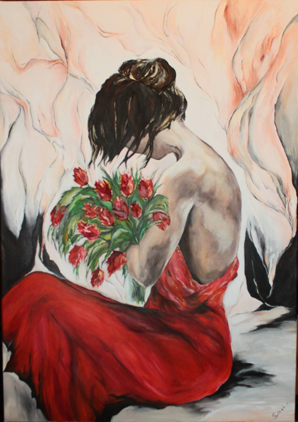 Na obrazie widzimy kobietę w czerwieni, która siedzi tyłem do nas, tuląc bukiet czerwonych tulipanów. Dominujący kolor czerwony kontrastuje z subtelnym tłem, na którym panują delikatne odcienie różu i beżu, co dodaje całemu dziełu elegancji. Jej włosy, ciemne i splecione w luźny kok, opadają miękko na szyję. Atmosfera obrazu jest nostalgiczna, jakby zatrzymana chwila pełna refleksji. Styl artysty przypomina malarstwo impresjonistyczne, choć nie brakuje w nim nowoczesnej nuty. Grubo kładzione pociągnięcia pędzla, te dynamiczne linie, nadają obrazowi życia i głębi. Technika kompozycji skupia się na kontrastach kolorystycznych i delikatnych cieniach, co uwydatnia subtelność chwili. Dzieło to emanuje spokojem i tajemniczą melancholią. Może wywoływać w odbiorcy uczucie tęsknoty za nieuchwytnym momentem. Jakbyśmy patrzyli na ulotną chwilę pełną emocji, które z trudem można opisać. W sercu budzi refleksje o pięknie i kruchości życia. "Wow, jaka piękna sukienka!" mogłoby powiedzieć dziecko, zauroczone intensywnością czerwieni. Słowo "mood" przychodzi na myśl jako idealne określenie atmosfery obrazu.