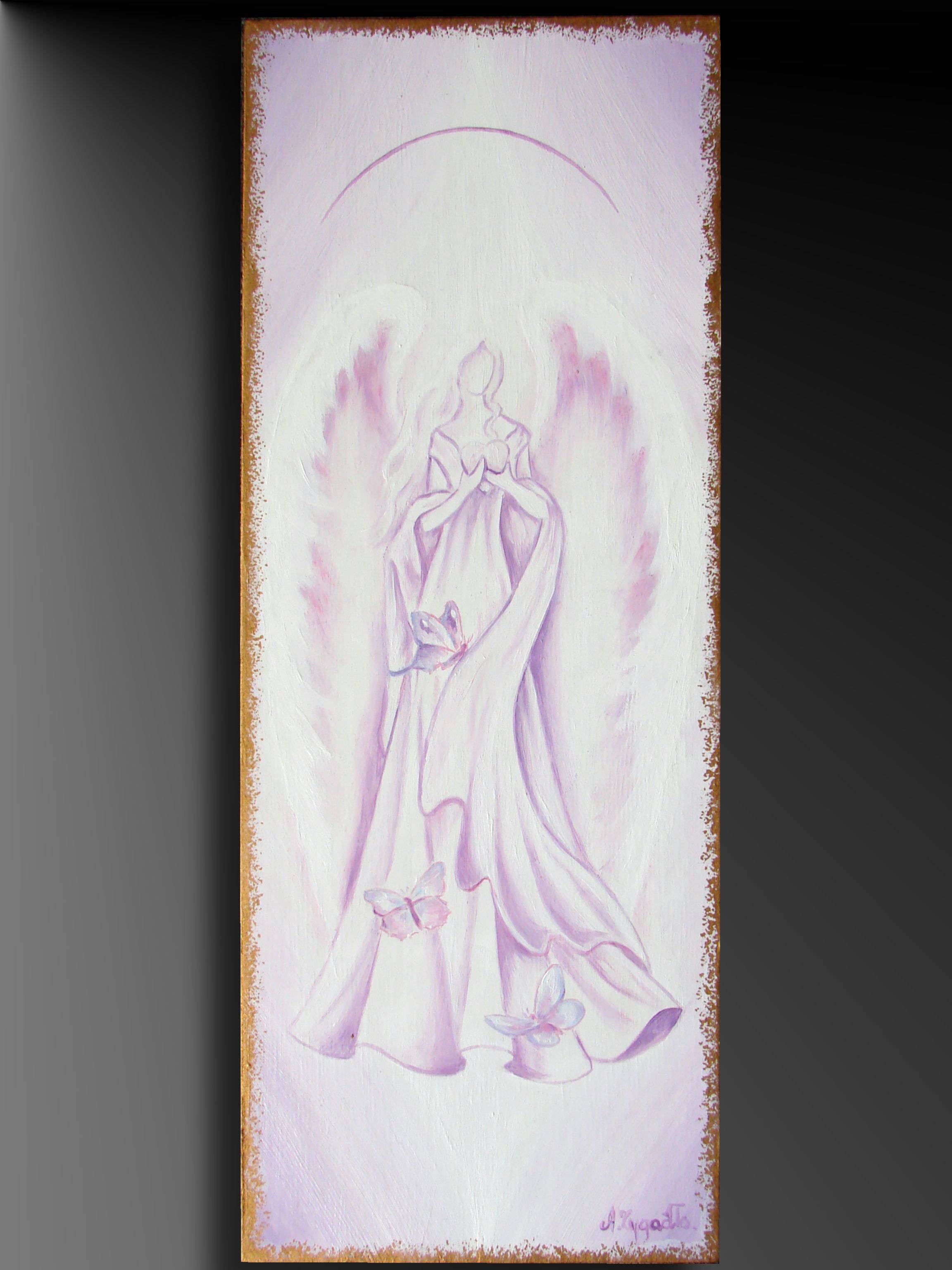 wymiary: 39 x 15 x 1,5 cm. waga 0,9 technika: olej na desce GŁADKA FAKTURA FARBY SYGNOWANY I WERNIKSOWANY (połysk satynowy) Obraz olejny ręcznie malowany wysokiej jakości farbami olejnymi na desce. Tło - odcienie liliowo-fioletowe. Boki zamalowane. Z tyłu obraz posiada regulowaną zawieszkę, haczyk i jest gotowy do powieszenia na ścianie. Sygnowany A. Zygadło. Indywidualne zamówienia Każdego z moich Aniołów mogę namalować w wybranych przez Państwa kolorach tła. Masz własny pomysł lub potrzebujesz czegoś w innym kolorze? ZAPRASZAM DO BEZPOŚREDNIEGO KONTAKTU Z ARTYSTĄ, WSZELKIE PYTANIA , NIEJASNOŚCI, INDYWIDUALNE ZAMÓWIENIA.
