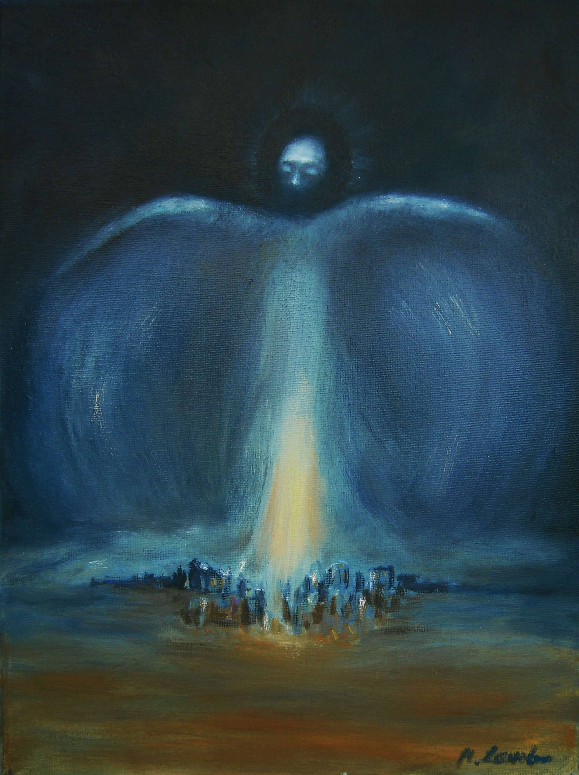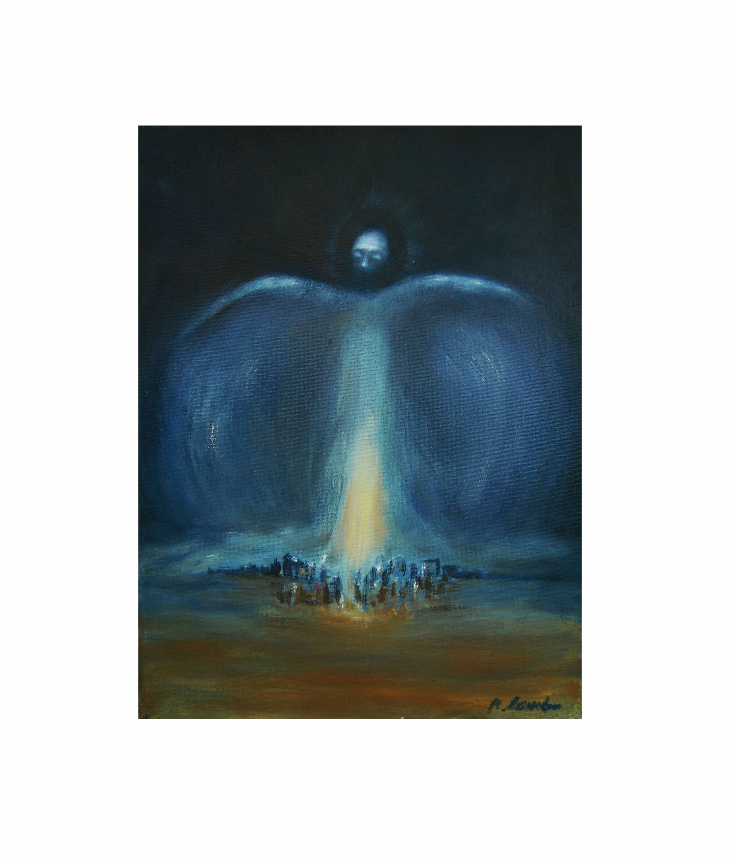 Na obrazie dominują ciemne, głębokie odcienie niebieskiego, tworząc tajemniczą i nieco mistyczną atmosferę. Centralnym elementem jest postać o rozłożystych "skrzydłach", które zdają się obejmować miasto u jej stóp. Jasna, świetlista kolumna światła przecina obraz, dodając mu dynamizmu. To, jak artysta używa światła i ciemności, przypomina techniki mistrzów baroku. Malarska faktura jest miękka, co wprowadza nastrój spokoju i zamyślenia, a jednocześnie niepokój. Obraz może budzić różnorodne emocje, od spokoju po fascynację. Trochę jak sen, w którym nie jesteśmy pewni, co się dzieje, ale czujemy się jednocześnie intrygowani i bezpieczni. "Wow, what is this light?" – pomyślałby ktoś, patrząc na to niezwykłe zjawisko. Jest w tym coś magicznego, coś, co skłania do refleksji nad naszym miejscem w świecie. A może to anioł stróż? Atmosfera jest zarówno wzniosła, jak i przytłaczająca. Artysta bawi się percepcją, zachęcając odbiorcę do osobistej interpretacji, pozostawiając przestrzeń na własne odczucia. obraz przedstawia cierpienie świata z powodu pandemii covid19 która zabiła ludzkie marzenia i zabrała istnienia ludzkie .