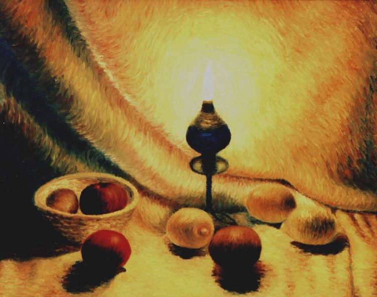 Na obrazie widzimy ciepłą scenę z lampą naftową rozświetlającą wnętrze. Jej żółte światło odbija się od miękkiej draperii, tworząc kalejdoskop ciepłych odcieni. W koszyku z lewej strony spoczywają owoce, które dopełniają kompozycję swoim naturalnym pięknem. Kształty są zaokrąglone, miękkie, co nadaje dziełu harmonii. Atmosfera jest przytulna, jakbyśmy przenieśli się do innej epoki, gdy czas płynął wolniej. Może to nostalgia, może chęć zatrzymania chwili. Styl obrazu przypomina impresjonizm z jego miękkim pociągnięciami pędzla i emphasis on light. cieniowanie jest subtelne, przypominające lekki szelest jedwabiu. Urok ten może wywoływać emocje związane z domem, ciepłem, bezpieczeństwem. Wizja lampy i owoców na pewno dotknie naszej duszy, wywołując tęsknotę za prostotą. A dziecko pewnie powie: "To wygląda jak bajka przed snem!". Subtelność sztuki oferuje wiele interpretacji, każda wyjątkowa jak widz, który na nią patrzy.