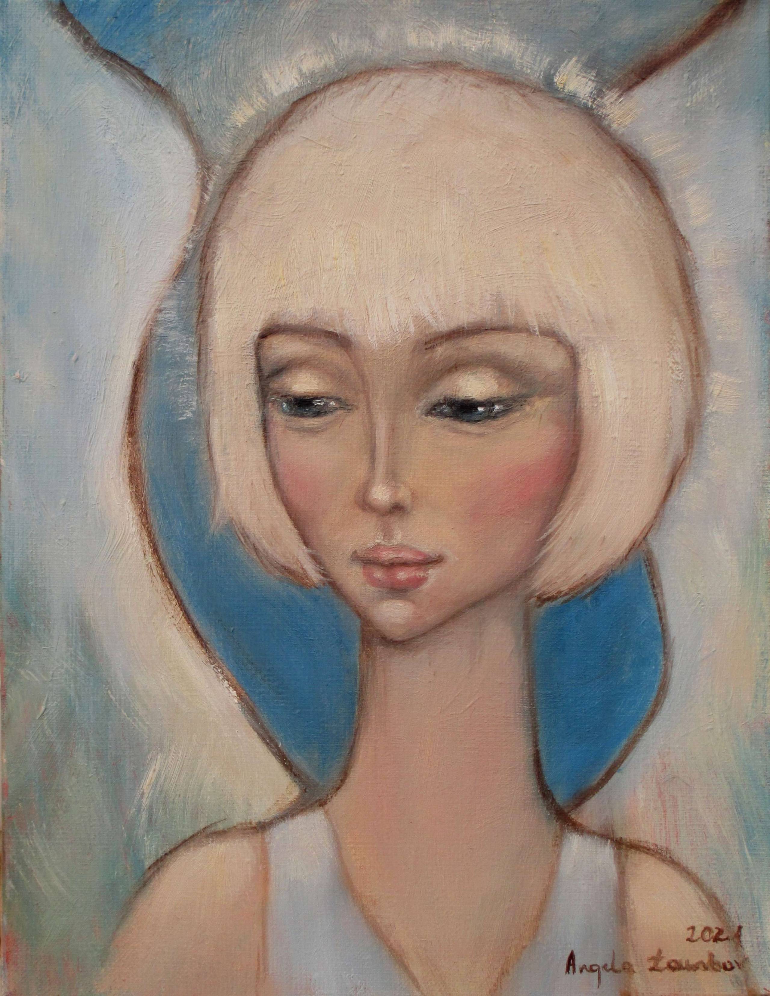 Na obrazie widzimy postać Anioła o delikatnych rysach twarzy, otoczoną subtelną aurą chłodnych barw. Pastelowe odcienie niebieskiego i białego tworzą harmonijną kompozycję, nadając dziełu niemal eterycznego charakteru. Włosy postaci, jasne i krótkie, współgrają z resztą palety, wprowadzając spokój i łagodność. Obraz emanuje pewną nostalgią, jakby artystka uchwyciła moment zamyślenia, zatrzymując czas. Styl malarski jest miękki i płynny, bez wyraźnych konturów, co dodaje całości subtelności. Można wyczuć wpływy impresjonistyczne, choć artystka zdecydowała się na bardziej niuanse, pastelowe podejście. Ktoś patrząc na ten obraz, może poczuć ciepło domowego ogniska, ale też lekką tęsknotę. To połączenie niewinności i tajemniczości urzeka i nie pozwala oderwać wzroku. Obraz jest spokojny a jednocześnie wzbudza pewien niepokój, który wzbudza pytania o myśli i uczucia ukryte za tym spokojnym obliczem. Wydaje się, jakby postać na obrazie znała jakieś sekrety, które tylko czekają, aby zostały odkryte przez dociekliwego obserwatora. Czy to nostalgia za utraconymi chwilami, czy może nadzieja na coś nieuchwytnego? Tego możemy się tylko domyślać. I tak oto artystka prowadzi nas przez emocjonalny rollercoaster, balansując między światem realnym a snem.
