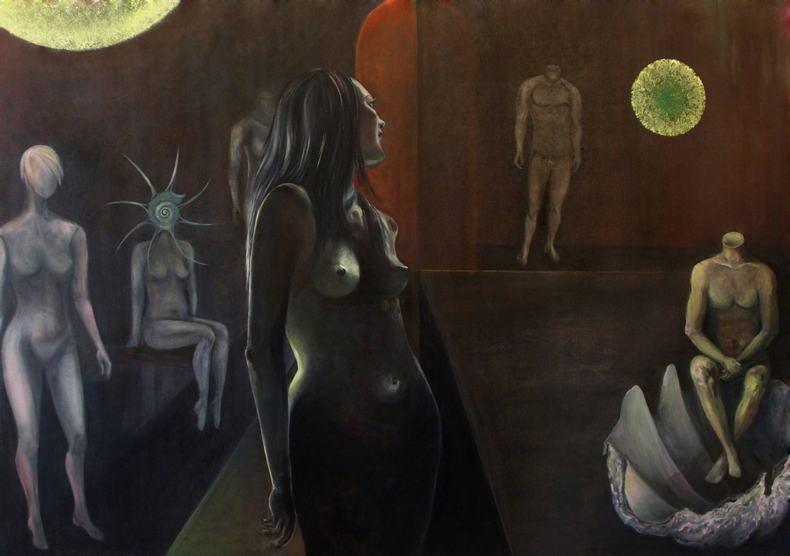 Obraz emanuje tajemnicą i symboliką, przykuwając wzrok chłodnym melanżem ciemnych kolorów z pojedynczymi jaskrawymi elementami. Dominują tu odcienie czerni, brązu i szarości, przerywane postaciami, które wydają się być częścią surrealistycznego świata. Centralna postać jest naga, z ciemnymi, długimi włosami, patrząca w głąb kompozycji. Wszystko tutaj jest jakieś takie zagadkowe i niepokojące. Wszystko otacza dziwna aura, trochę jak ze snu (lub koszmaru?). Styl artysty jest ekspresyjny, korzysta z miękkich pociągnięć pędzla, które nadają tajemniczy nastrój. Zdaje się, że obrazuje wewnętrzne emocje i lęki. Obraz wywołuje w widzu mieszane uczucia. Z jednej strony fascynację, z drugiej - niepewność. Czy to wszystko ma sens, czy to tylko imagination? I jest tam taki pan bez głowy, super śmieszny! Może to pytanie o nasze miejsce w świecie, o zagubienie. Może to tylko chaotyczne myśli artysty, w których widz musi znaleźć własne znaczenie. Takie spotkanie z sztuką to prawdziwa przygoda.
