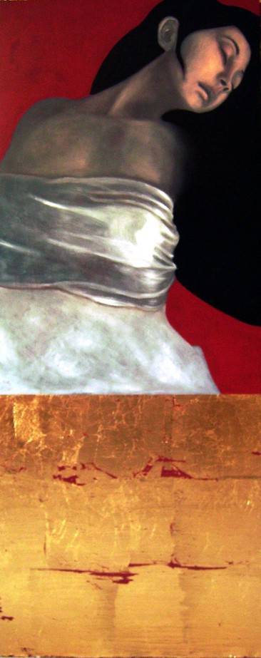 Na tym obrazie dominują intensywne kontrasty kolorów. Tło w głębokiej czerwieni zestawia się z delikatnością jasnoszarej postaci. Postać kobiety zanurzona jest w zadumie, pochylona głowa i zamknięte oczy tworzą atmosferę spokoju i introspekcji. Jej czarne jak noc włosy płynnie przechodzą w tle, jakby artysta chciał połączyć postać z otoczeniem, kreując jedno continuum. Kompozycja jest dynamiczna, z mocnym podziałem na poziomy — akcent położony jest na złoty prostokąt w dolnej części obrazu, który dodaje dziełu szlachetności. Styl artystyczny emanuje wyrafinowaną prostotą, a efekt malarski uzyskany jest dzięki subtelnym pociągnięciom pędzla i grze światła oraz cieni. Technika mieszana, śmiało można powiedzieć, że to mix tradycji z nowoczesnością. Jakby artysta pozwalał nam patrzeć na fragment snu, zgadywać czym jest "dreamlike" rzeczywistość. Dla mnie, twarz tej kobiety to esencja spokoju. Obraz niesie ze sobą emocje ulotności i melancholii, prowokując widza do zastanowienia się nad chwilowością życia. Możemy poczuć rodzaj nostalgii, jakbyśmy patrzyli na wspomnienie z przeszłości. Dziecko powiedziałoby proste: "Ona śpi". Ale ileż to snu w tym śnie! Że aż nie można się nadziwić, ile w takiej ciszy można odnaleźć.