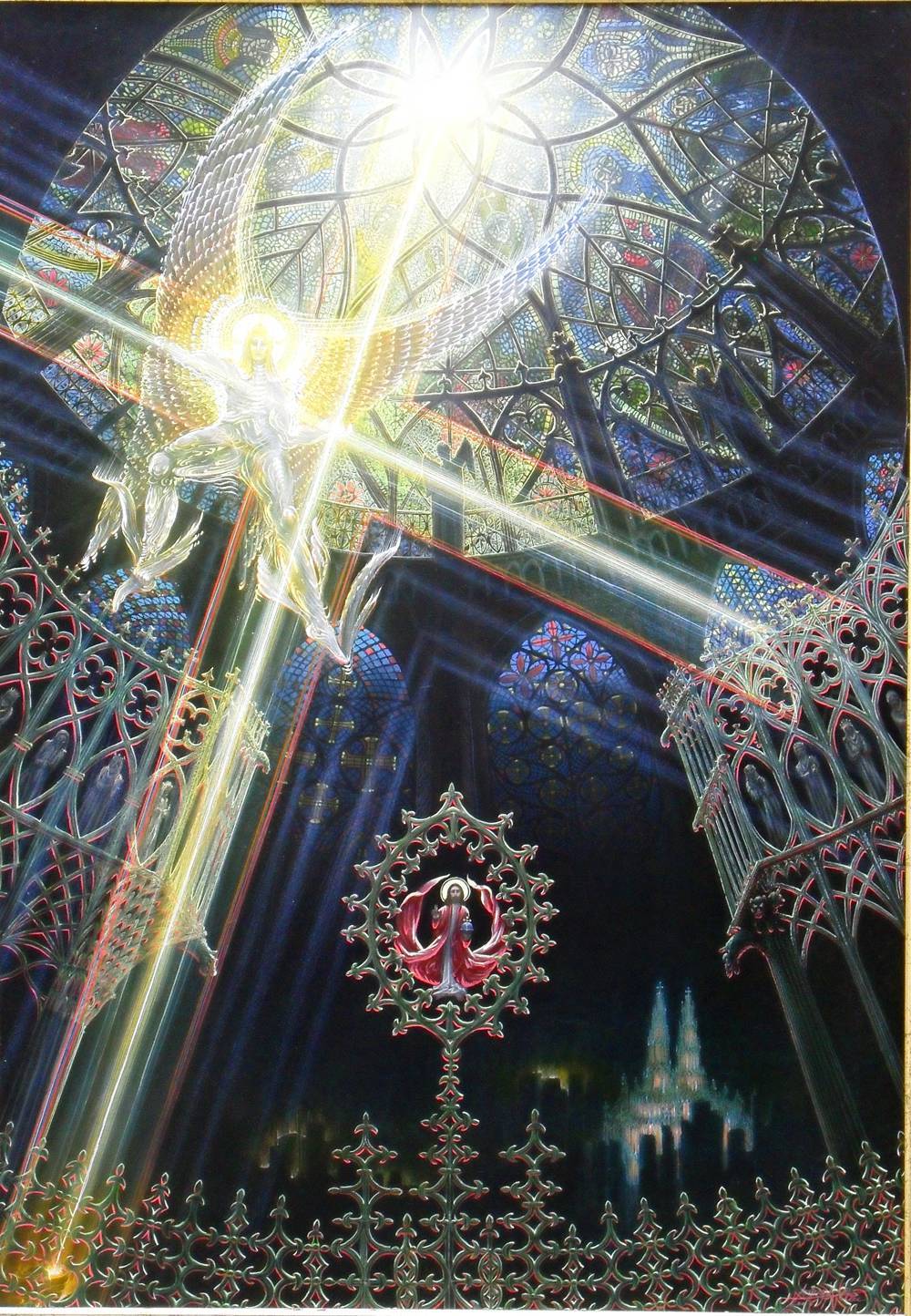 Obraz tętni życiem i feerią barw, które mieszają się na tle majestatycznej architektury sakralnej. Dominujące głębokie niebieskości kontrastują z ciepłymi złocistymi refleksami świetlistych promieni, które zdają się emanować ze świetlistej postaci anioła. Niebo witrażu eksploduje kolorami, jakby samo światło chciało porwać się na tęczowy taniec. Atmosfera jest magiczna, niemalże mistyczna, jakbyśmy znaleźli się na granicy świata materialnego i duchowego. Może ktoś powiedzieć "Wow, to jak z bajki!" Artysta zastosował techniki witrażowe, które dodają całości gotyckiego uroku. Linie są delikatne, misternie splecione jak koronkowy wzór. Aż chce się dotknąć, by poczuć chropowatość wyrazistych kształtów. Obraz zachwyca głębią i złożonością, przywołuje uczucie podziwu i spokoju. Jest pełen dynamiki, a jednak emanuje ciszą, jakby czas stanął w miejscu. To taki magiczny moment, w którym znikają wszystkie troski świata. Patrząc na ten obraz, można poczuć się jak w jakimś "dreamlandzie". Ciekawe, co by człowiek zobaczył, gdyby mógł sam przenieść się w to miejsce.