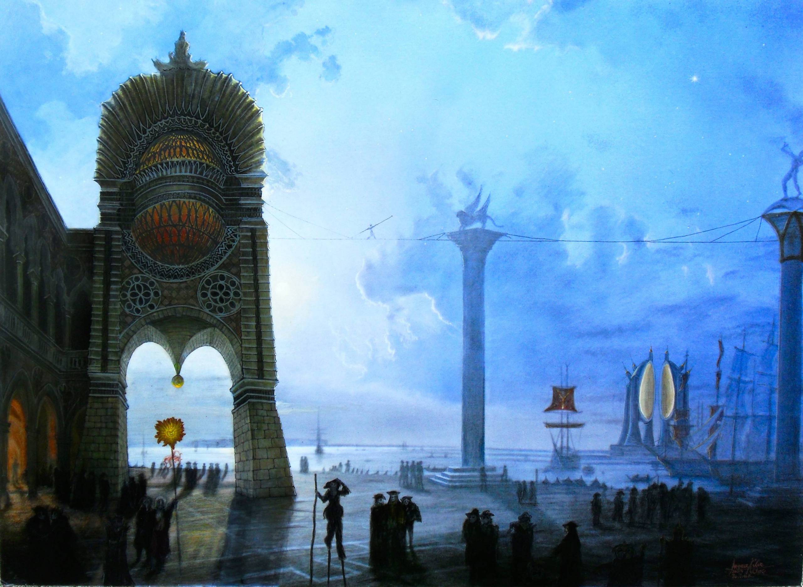 Na tym magicznym obrazie dominuje błękitne niebo, które promieniuje spokojem i tajemnicą. Wieżyczki i statki majaczą na horyzoncie, a każda bryza zdaje się przesycać powietrze dźwiękiem morskich fal. W samym centrum uwagi znajduje się monumentalna brama o intrygująco symetrycznej konstrukcji, której ciekawe wzory przyciągają wzrok. Jasne światło wpada przez łuk, tworząc kontrast z ciemnymi postaciami na pierwszym planie. Efekt wow jest oczywisty - to obraz z duszą. Artysta stosuje subtelne przejścia tonalne i delikatne pociągnięcia pędzla, dodając obrazowi lekkości. Atramentowa granat nocnego nieba przenika głębie kompozycji, wprowadzając melancholię. Może wywoływać uczucia nostalgii czy zadumy nad nieuchwytnym pięknem chwil. "Look, a magic tower!" powiedziałby zachwycony maluch. Kompozycja balansuje między magicznym realizmem a fantastycznym snem. Patrząc na ten obraz, myślę o podróżach w nieznane, gdzie wyobraźnia łączy się z rzeczywistością.