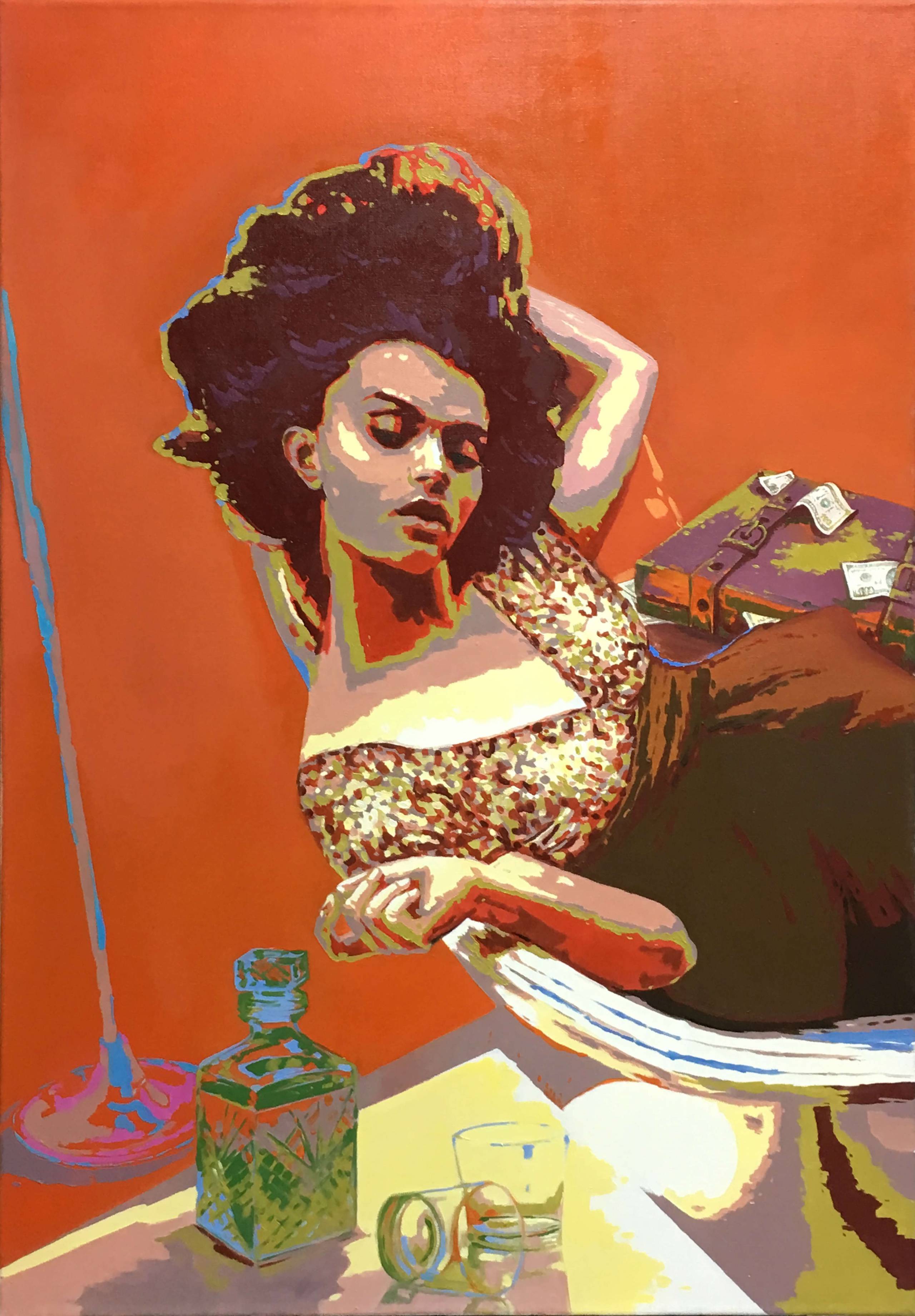Na obrazie widać postać leżącą na hamaku, otoczoną intensywną feerią barw. Dominujący pomarańcz tła kontrastuje z wyraźnie zaznaczoną sylwetką kobiety. Jej ciemne, bujne włosy rozsypały się swobodnie na tle, jakby były jedwabiem rozłożonym na płótnie. Obok niej znajduje się walizka pełna banknotów, a w pobliżu stoi szklanka i butelka, co dodaje nuty tajemniczości i luksusu. Całość jest trochę jak scena z filmu noir, pełna ukrytych znaczeń i sekretów. To, co przyciąga wzrok, to pastelowy motyw, który przypomina styl pop-artu. Linie są wyraziste, a kolory płynnie przechodzą z jednego tonu w drugi. Artysta użył techniki, która sprawia, że obraz wydaje się wręcz pulsować, żyć własnym rytmem. Obraz emanuje spokojem i pewnym rodzajem hedonizmu. Można wręcz poczuć upalne popołudnie, łagodny szept wiatru w tle. Albo może to tylko sen na jawie. Taki obraz, że aż chce się położyć obok tej tajemniczej damy i zapytać: "Hej, o czym myślisz?". 7-latek by powiedział: "Ta pani wygląda jakby śniła o wakacjach." Dreamlike, powiedziałby angielski poeta. I faktycznie, jest coś nieuchwytnego, niemal magicznego w tej kompozycji, co można długo rozważać, ale tak naprawdę nigdy do końca nie odkryć.